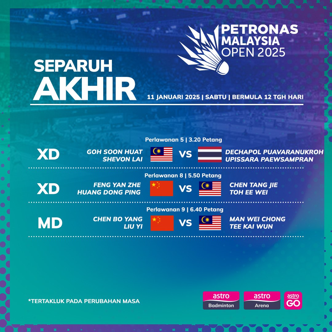 Saksikan perjuangan wakil negara di kejohanan berstatus Super 1000 itu secara langsung di Astro Arena saluran 801HD, Astro Badminton (815) dan live streaming di Astro Go bermula jam 3.00 petang.