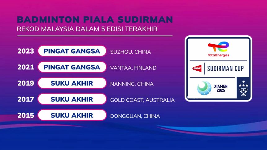 Untuk rekod, pencapaian terbaik kontinjen negara di Piala Sudirman adalah ke peringkat separuh akhir untuk tiga edisi -- 2009, 2021 dan 2023.