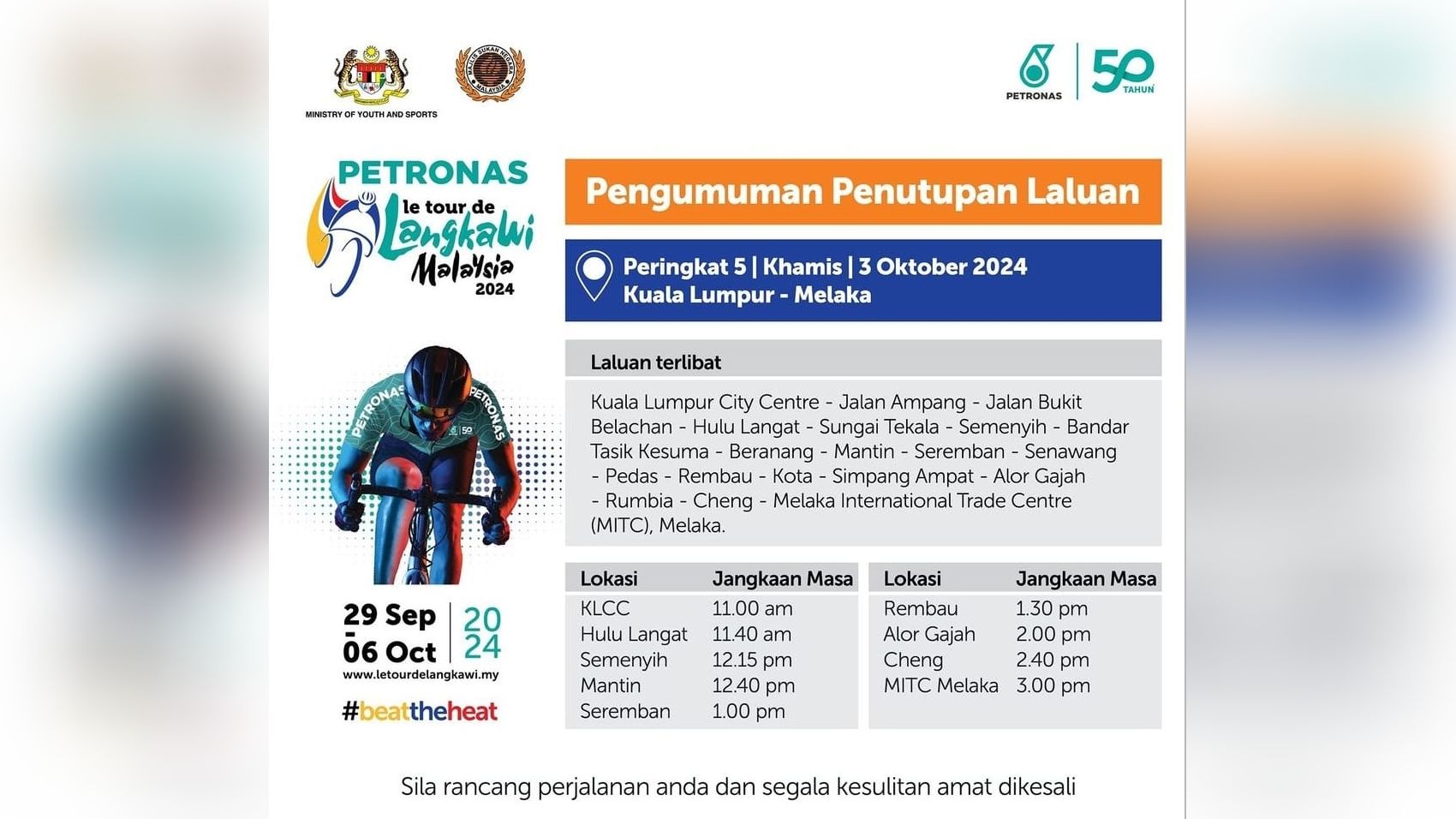 Berikut merupakan info penutupan laluan menjelang saingan pusingan kelima Petronas Le Tour de Langkawi (LTdL) 2024 melibatkan Kuala Lumpur-Melaka, esok.