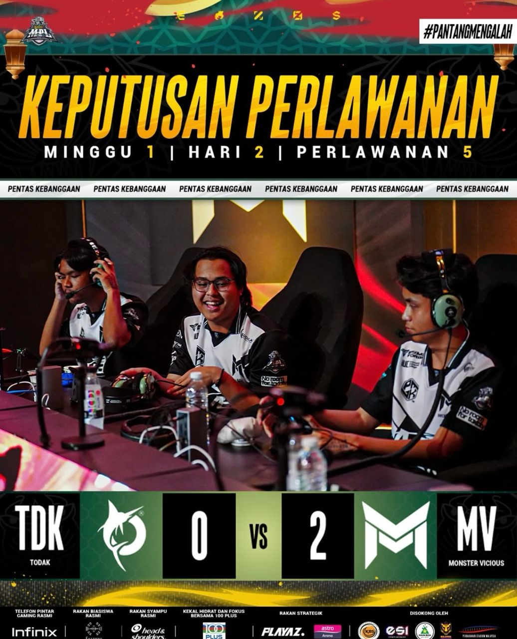 Perlawanan tumpuan hari kedua, minggu pertama Liga Profesional Mobile Legend Bang-Bang Malaysia (MPLMY), membabitkan Monster Vicious (MV) menentang Todak yang berkesudahan MV menang bergaya 2-0, sebentar tadi.