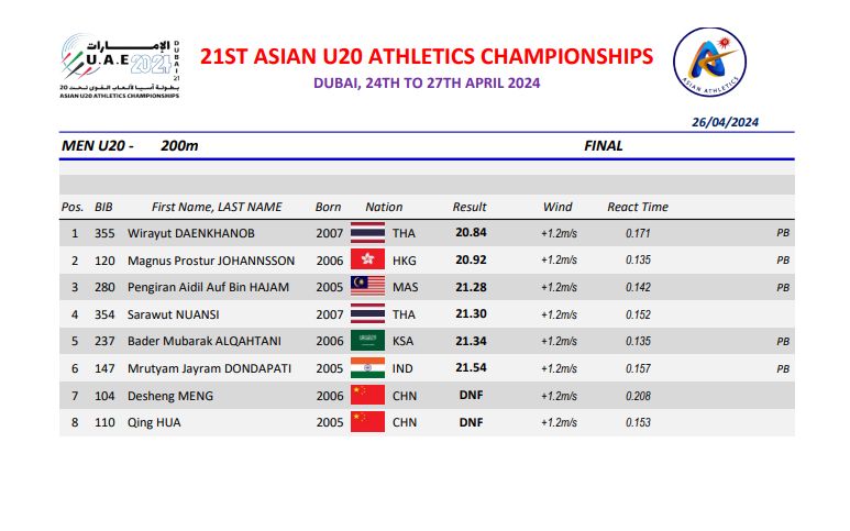 21.28 saat menjadi catatan terbaik peribadi Pengiran untuk meraih gangsa sementara wakil Thailand, Wirayut Daenkhanob meraih emas sementara Hong Kong di tempat kedua.