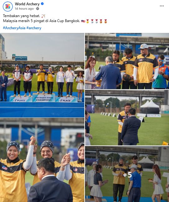 Badan induk memanah dunia, World Archery, menggunakan Bahasa Melayu dalam satu kiriman Facebook sebagai menyambut kejayaan skuad negara meraih lima pingat dalam Kejohanan Memanah Piala Asia Peringkat 1 semalam.