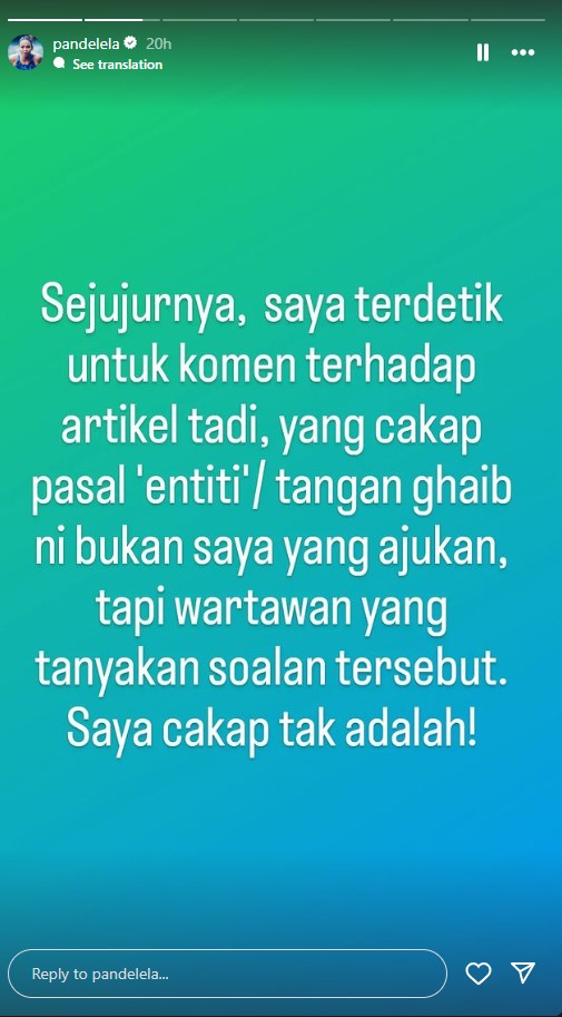 "Sejujurnya, saya terdetik untuk komen terhadap artikel tadi, yang cakap pasal 'entiti'/tangan ghaib ni bukan saya yang ajukan, tapi wartawan yang tanyakan soalan tersebut. Saya cakap tak adalah!", jelas Pandelela di laman instragram peribadinya.