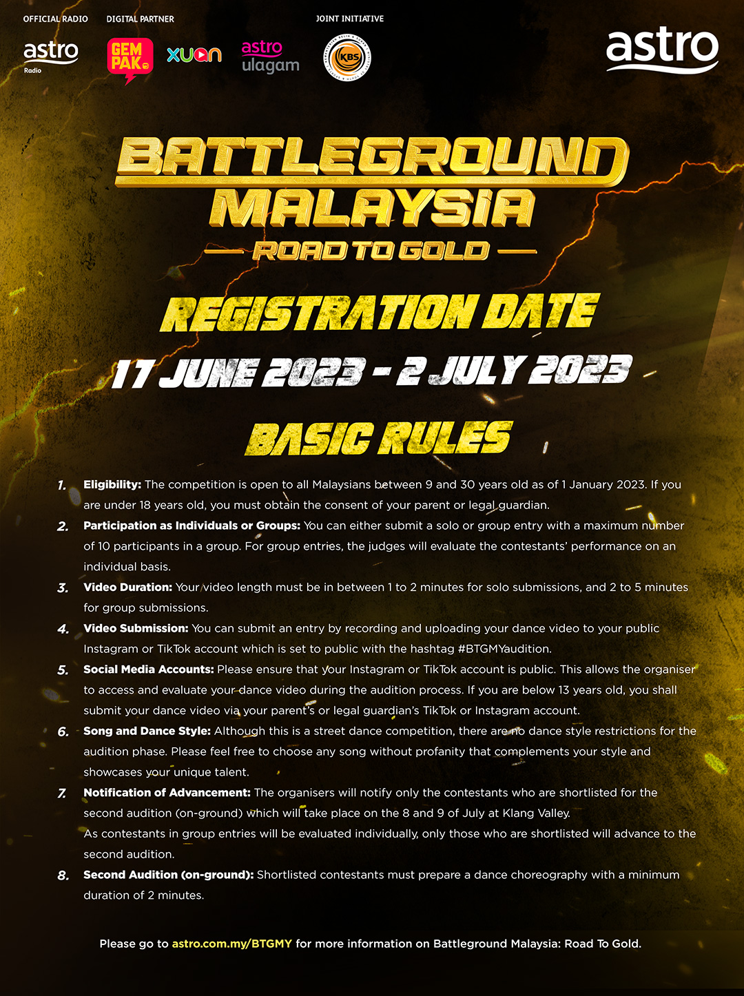 Uji bakat untuk Battleground Malaysia: Road to Gold dengan post rutin tarian anda, sama ada solo atau berkumpulan menerusi TikTok/Instagram dengan hashtag #BTGMYaudition.