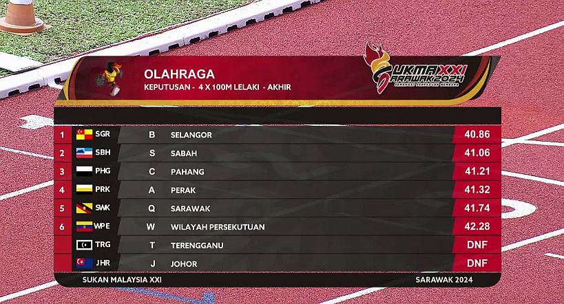 Memulakan perlumbaan di lorong kelapan, Selangor mendahului perlumbaan sejak di awal saingan dengan pertukaran baton yang dilakukan oleh setiap pelari cukup baik sebelum mereka menamatkan perlumbaan di tempat pertama.