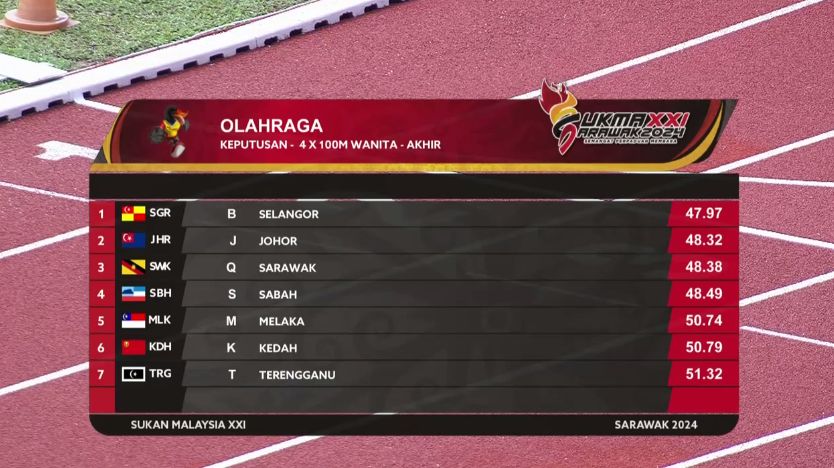 Sabah dan Pahang melengkapkan podium manakala Johor dan Terengganu gagal menamatkan perlumbaan.