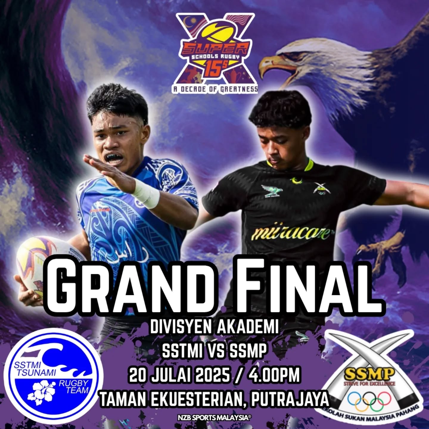 Semua mata kini tertumpu ke Taman Ekuestrian Putrajaya apabila dua pasukan elit ragbi sekolah; Sekolah Sukan Malaysia Pahang (SSMP Falcons), dan juara bertahan, Sekolah Sukan Tunku Mahkota Ismail (SSTMI Tsunami), bakal berentap dalam Grand Final Divisyen Akademi Super Schools Rugby (SSR) 2025 pada petang Ahad ini.