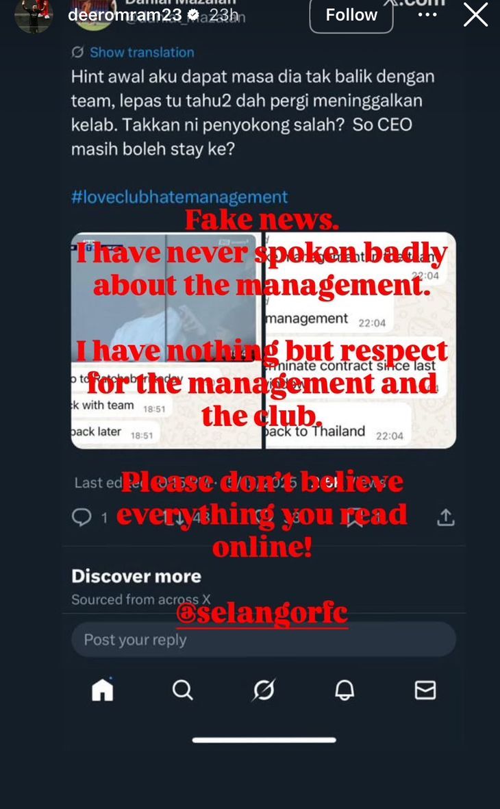 "Saya menghormati pihak pengurusan dan kelab ini (Selangor), tolong jangan percaya segala yang anda baca di atas talian." katanya.