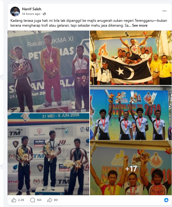 Dalam satu kenyataan di laman sosial malam tadi, Harrif -- yang kariernya merentasi berbasikal trek mahupun lebuh raya -- bersedih seolah-olah jasanya bagaikan tidak dihargai sekalipun pernah menggondol pelbagai gelaran dan pingat sambil menegur sikap Majlis Sukan Negeri (MSN) Terengganu agar tidak meminggirkan bekas atlet sepertinya.