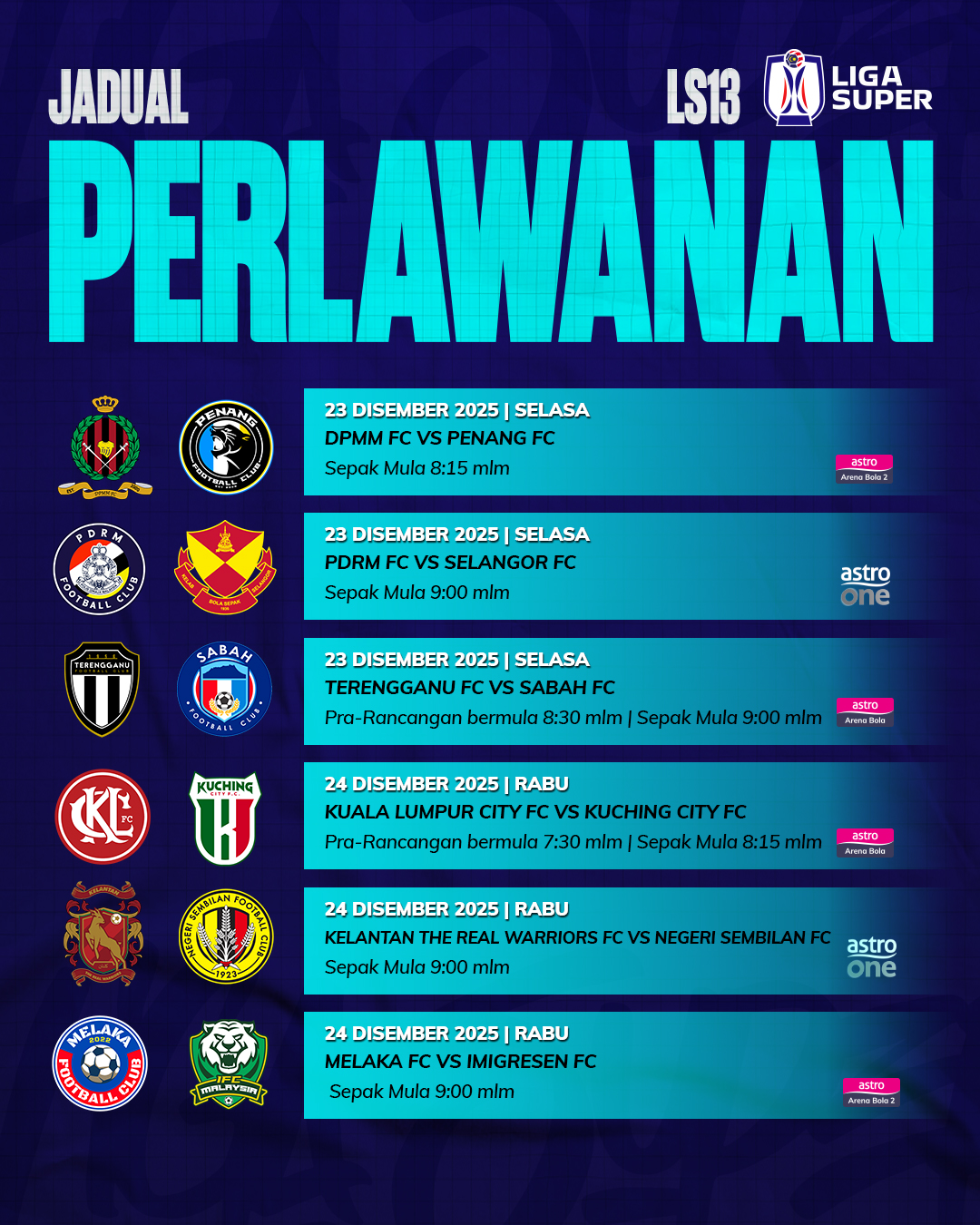 Saksikan siaran langsung perlawanan LS13 yang akan bermula Selasa ini, 23 Disember 2025!#LigaSuper2025-26 #DemiLigaKita #LigaMalaysia #IniPadangKita pic.twitter.com/LaEOLEoKd7— Malaysian Football League (@MFL_MY) December 21, 2025