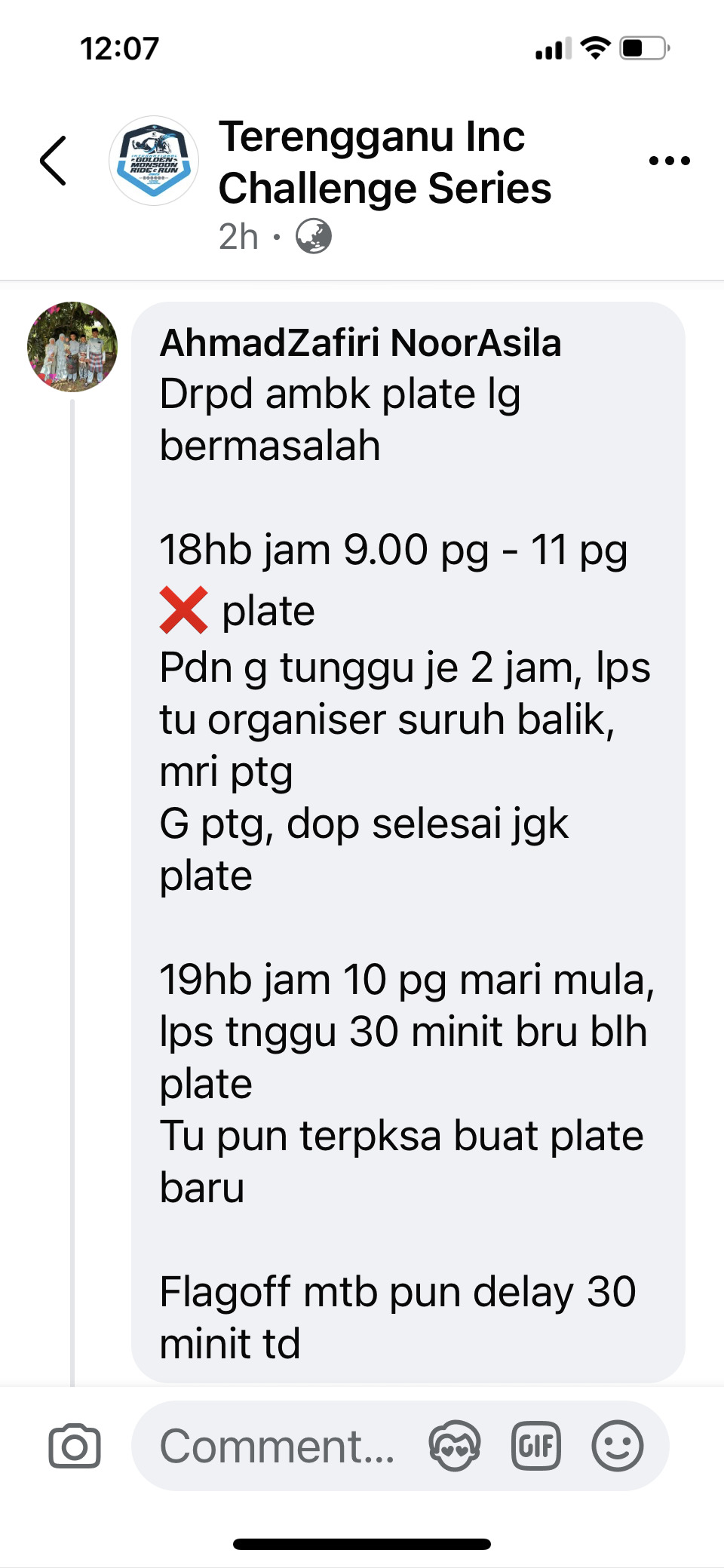 ".. 18hb tunggu dua jam, lepas itu organizer suruh balik mari petang. Petang pun tidak selesai juga. 19 hb hadir 10 pagi.. tunggu 30 minit baru boleh plate(nombor daftar pelumba). Itu pun terpaksa buat plate baru. Flag off mtb pun lewat 30 minit.." ujar beliau yang juga merupakan atlet berbasikal yang sering mewarnai arena perlumbaan tempatan.