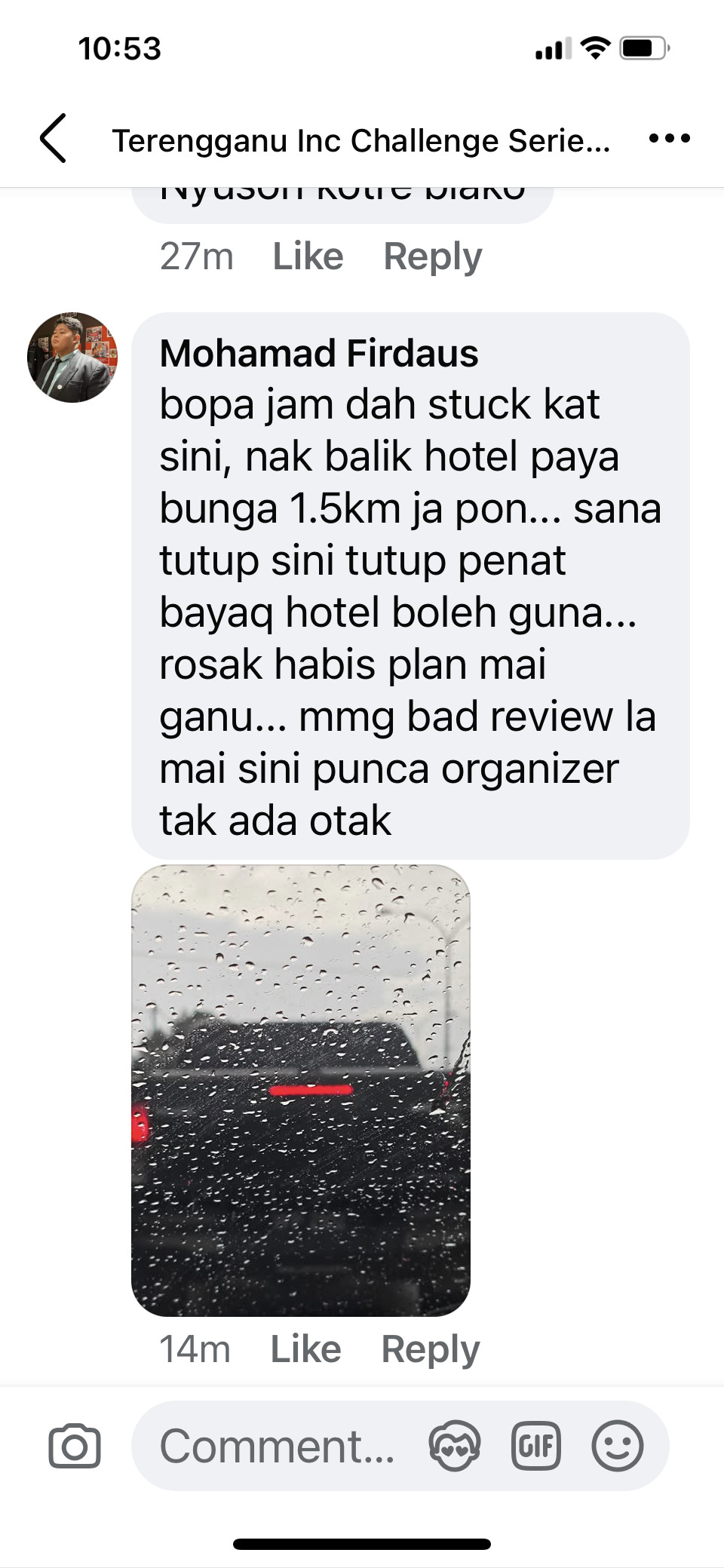"..nak balik ke hotel 1.5km(pada jarak) ja pon.. sana tutup sini tutup penat bayaq hotel.. rosak habis plan mai ganu..," cetus Mohamad Firdaus di laman sosial penganjur acara sukan itu.
