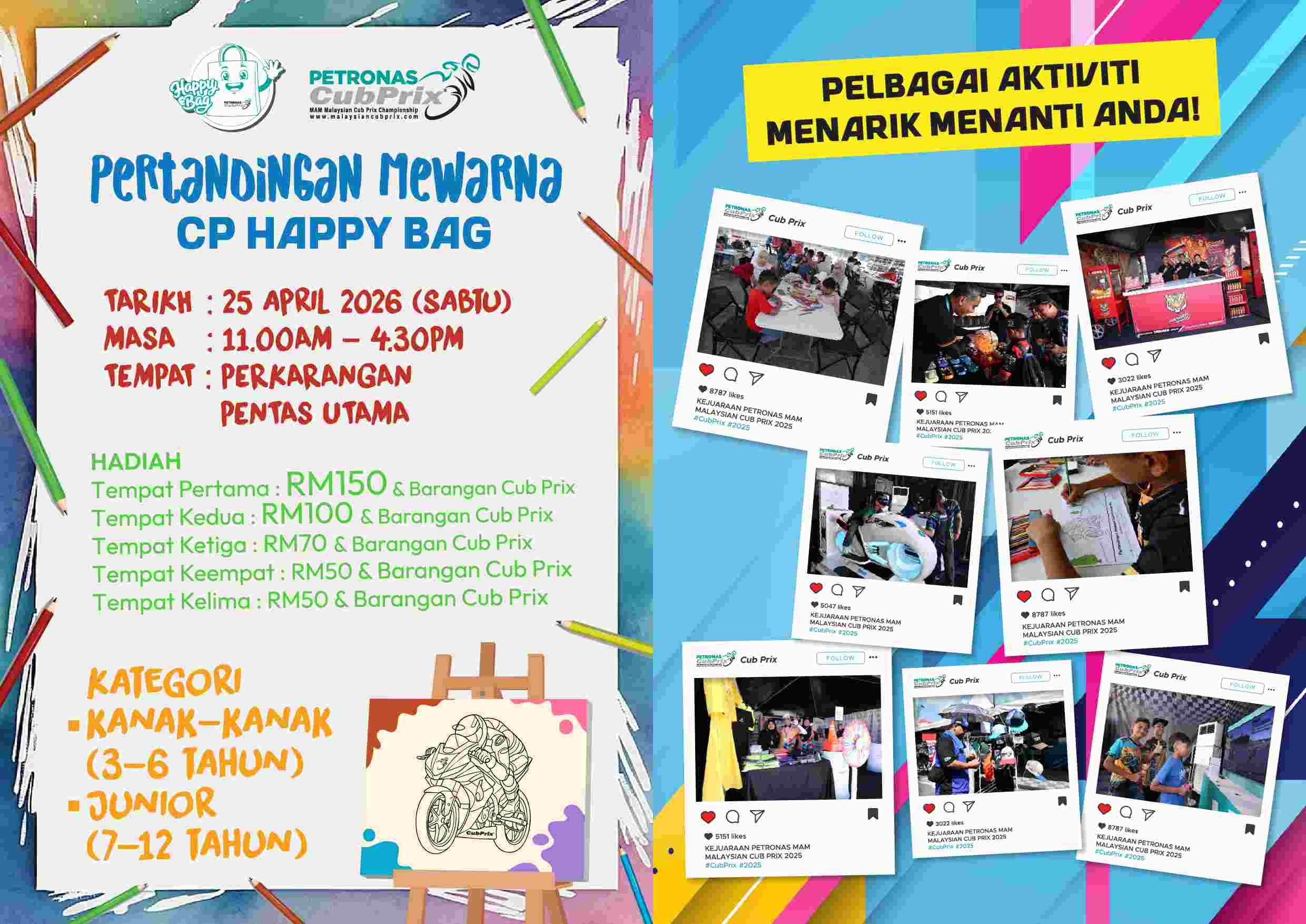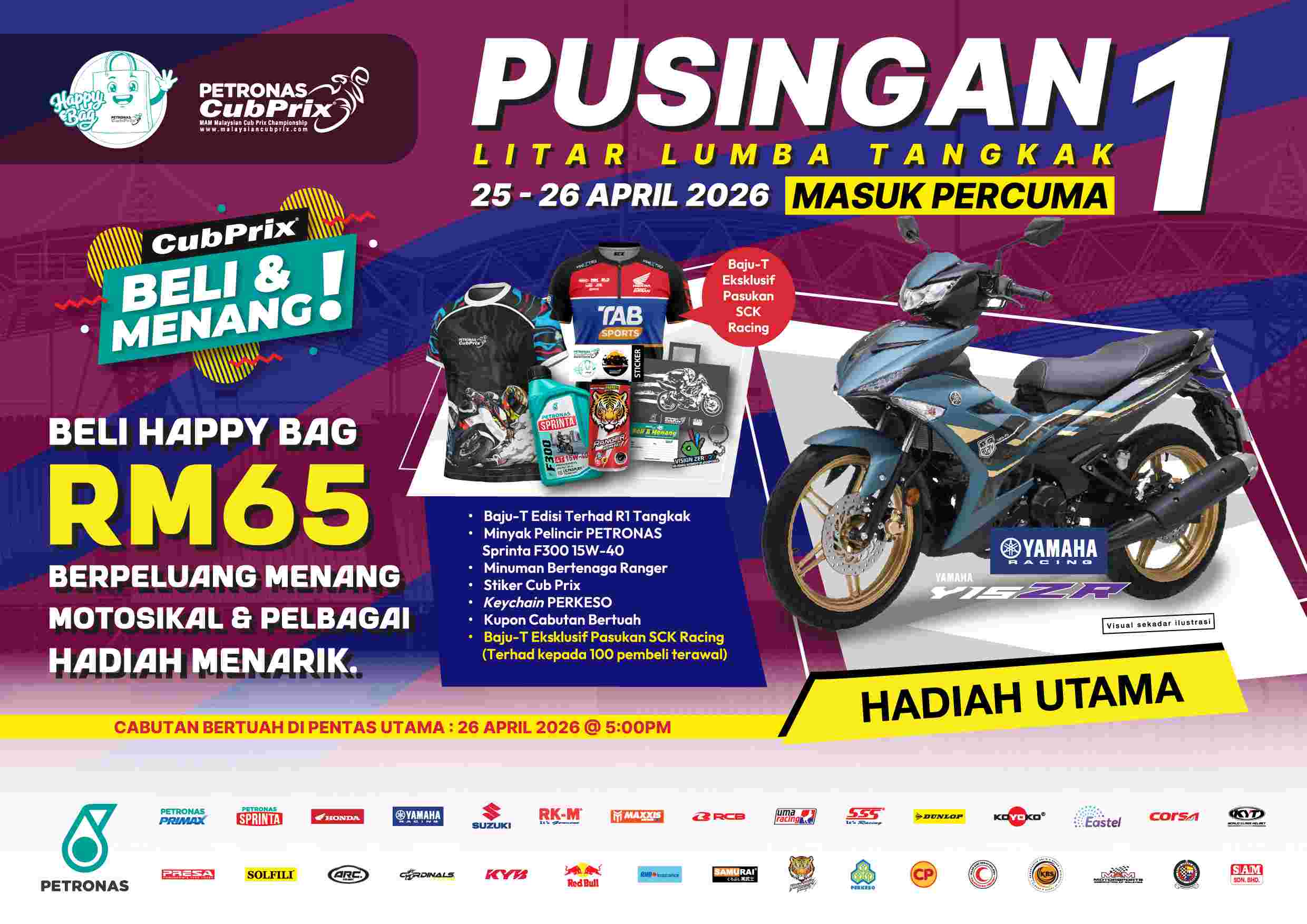 Jangan lupa, singgah ke gerai Cub Prix, dapatkan Happy Bag dan tunggu untuk cabutan bertuah di pentas utama pada 5 petang pada Ahad untuk mengetahui jika anda pemenang motosikal Y15-ZR.
