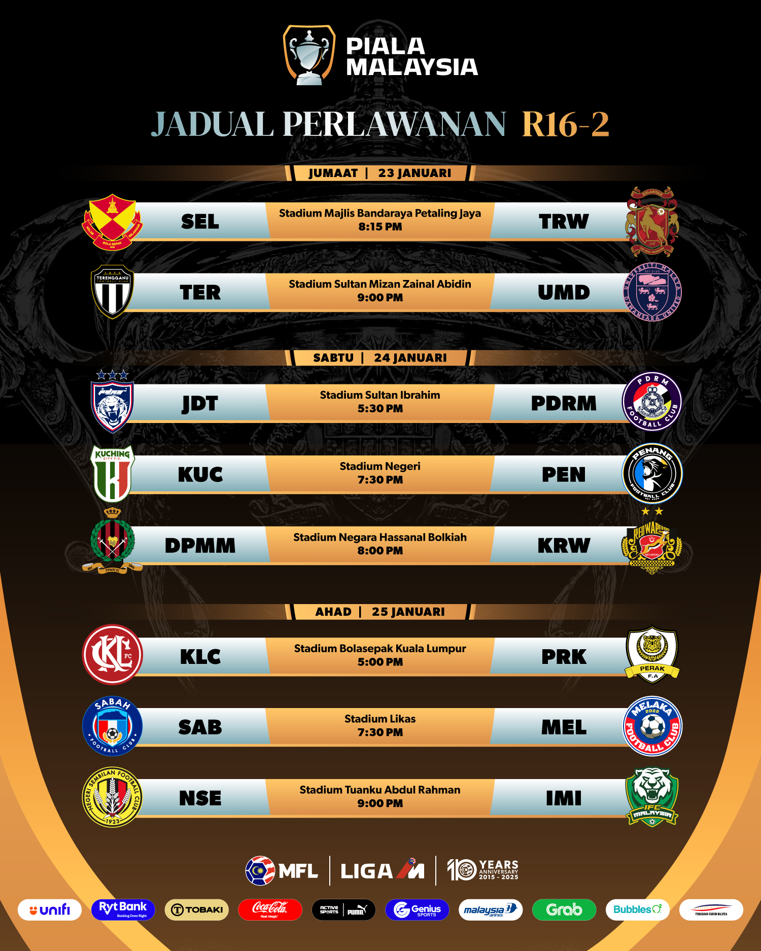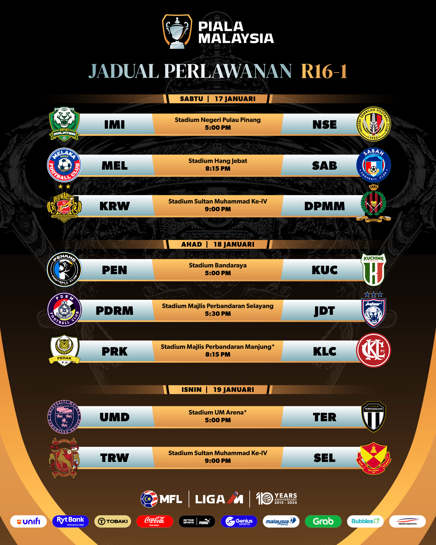 Dengan undian Piala Malaysia melibatkan 16 pasukan yang merangkumi Liga Super dan tiga kelab Liga A1 Semi-Pro berlangsung Jumaat lalu, Liga Bolasepak Malaysia (MFL) sebentar tadi mengumumkan jadual rasmi bagi aksi timbal balik pusingan 16 itu.