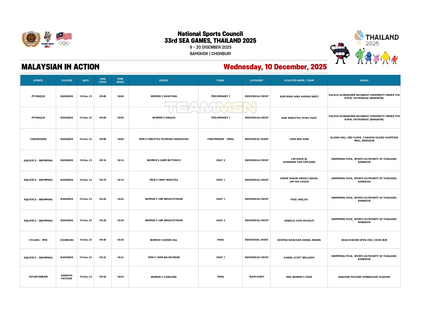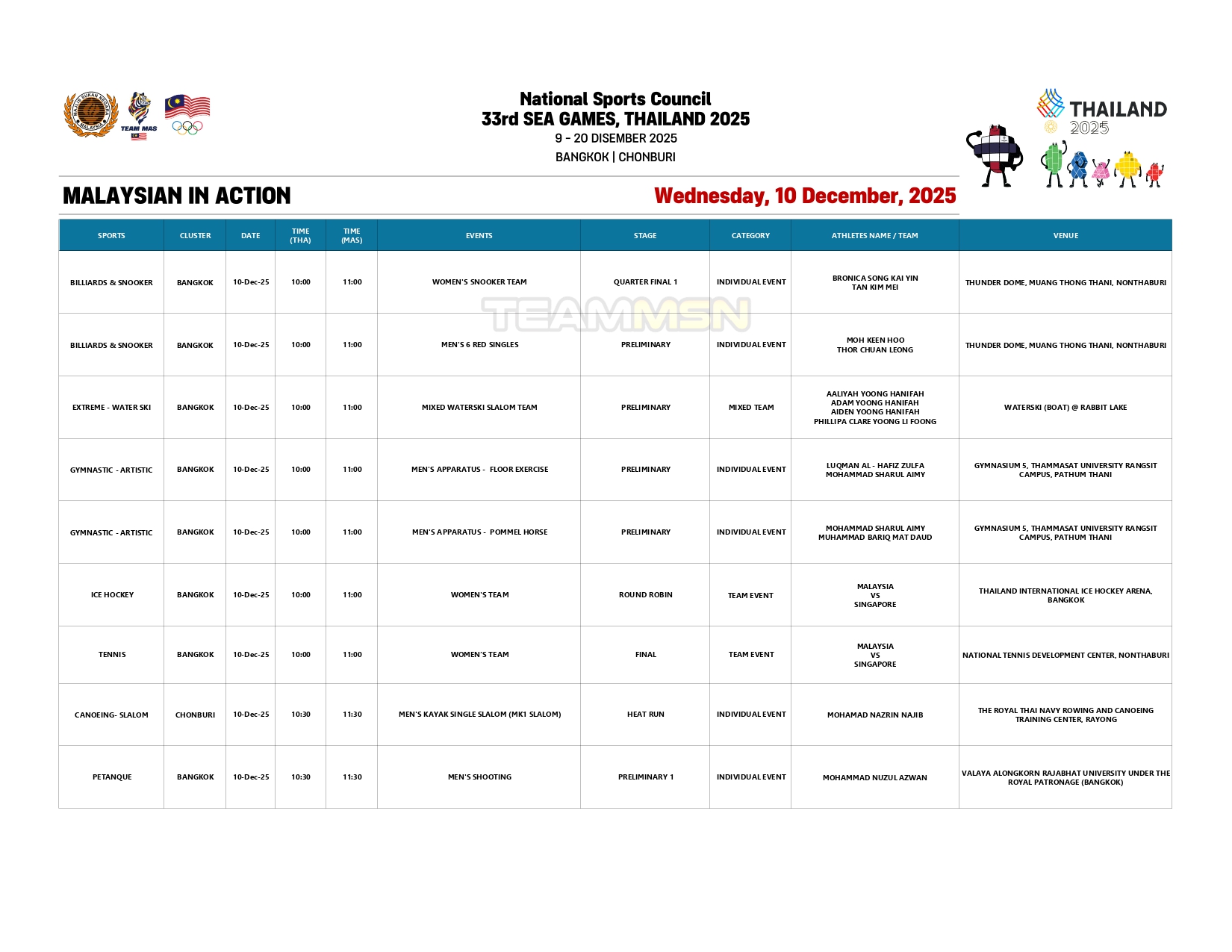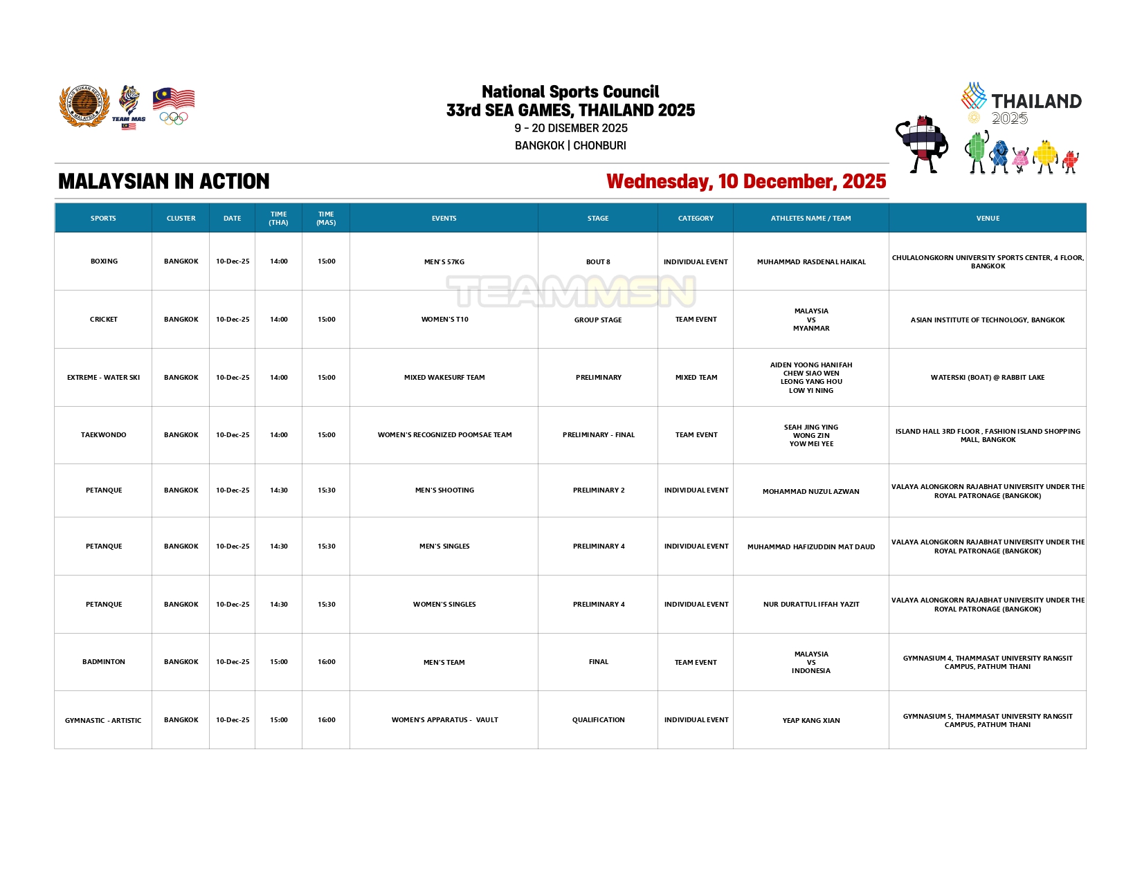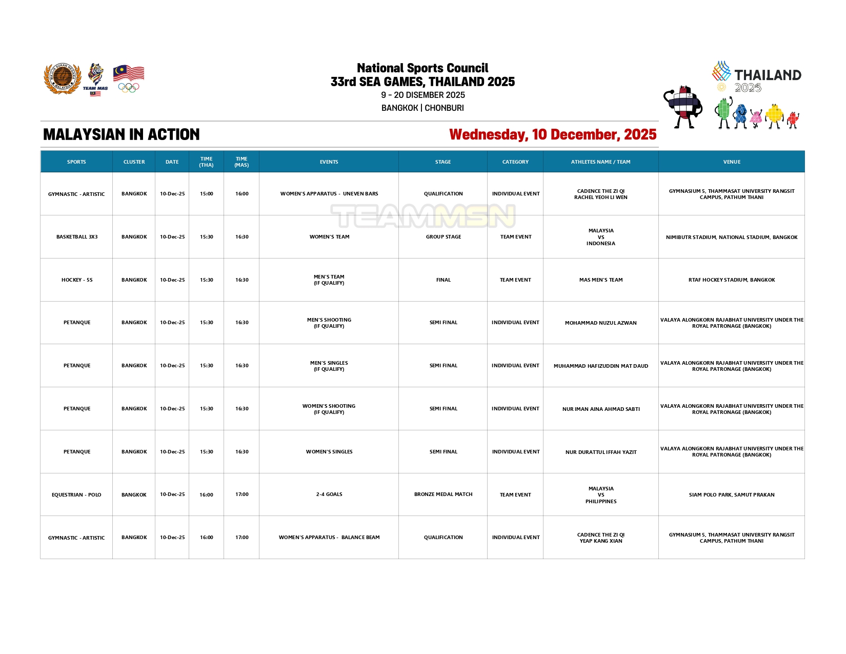 Berikut merupakan jadual penuh kontinjen negara hari ini: