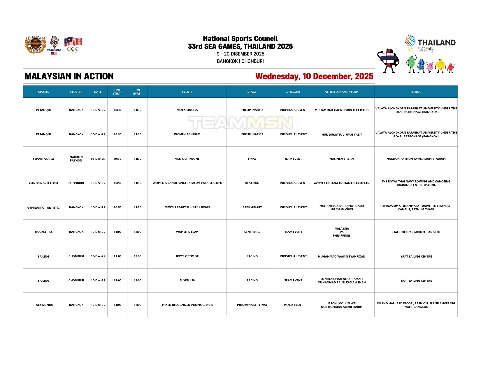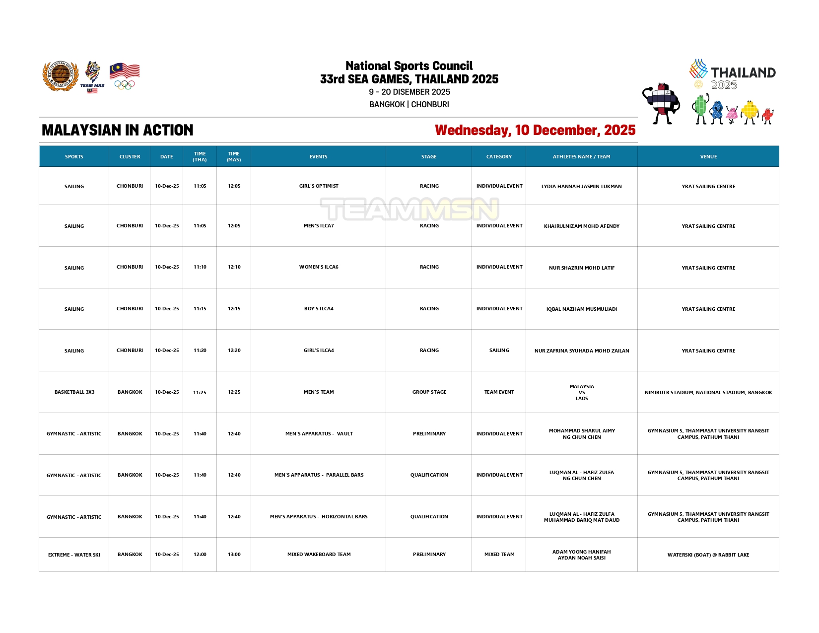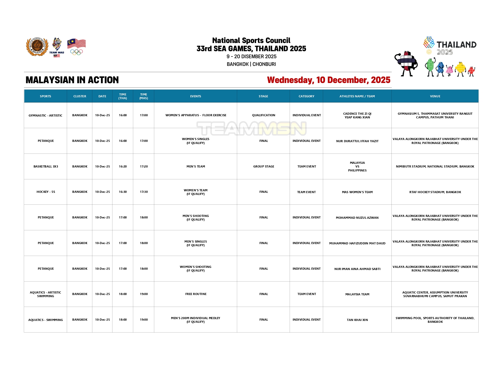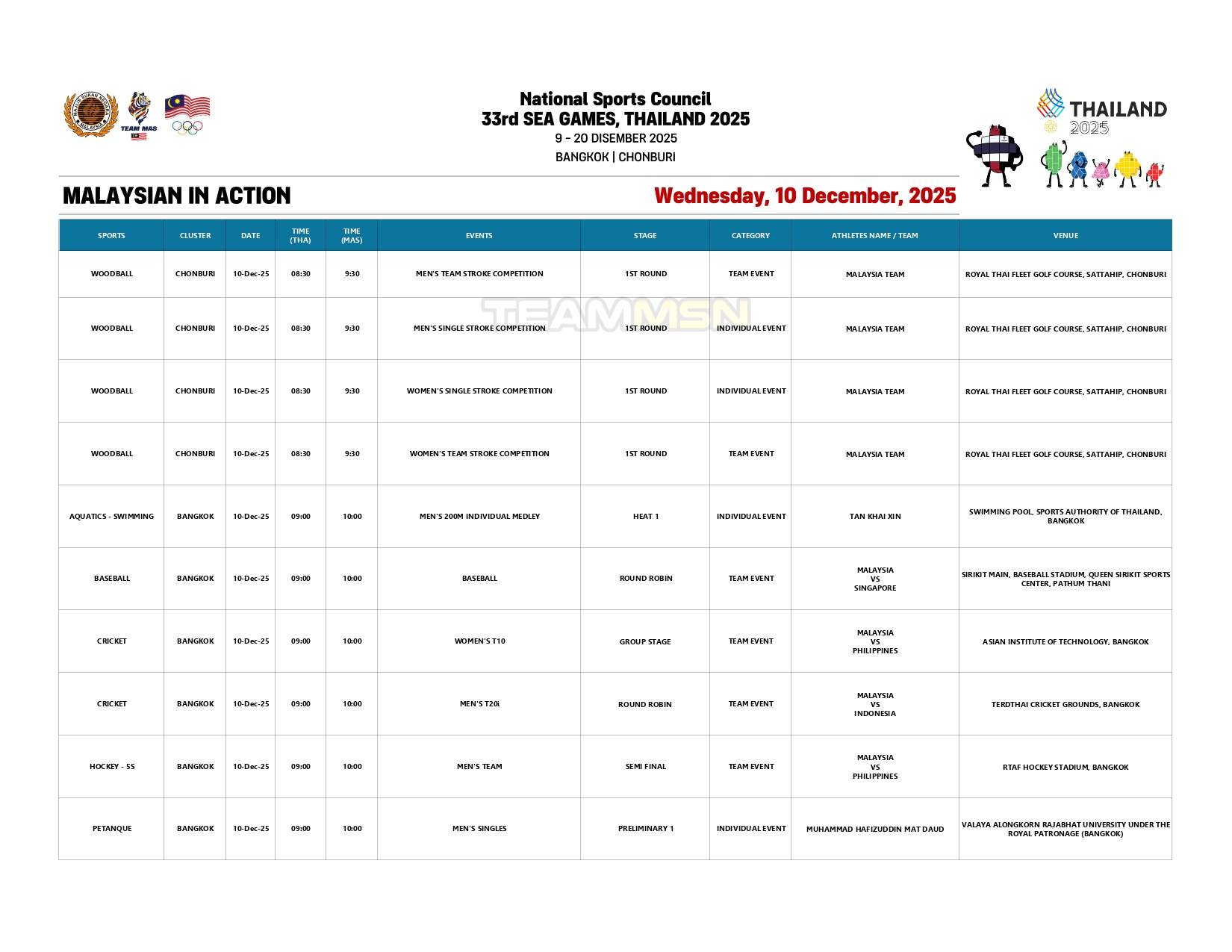 Berikut merupakan jadual penuh kontinjen negara hari ini: