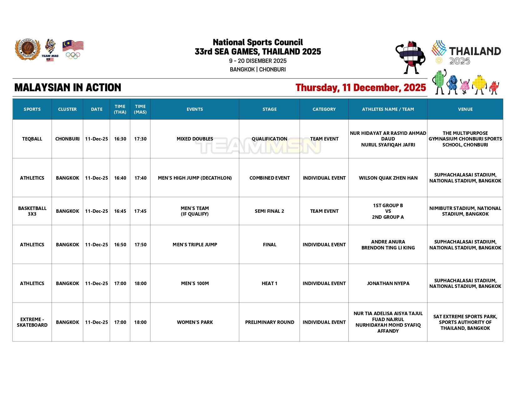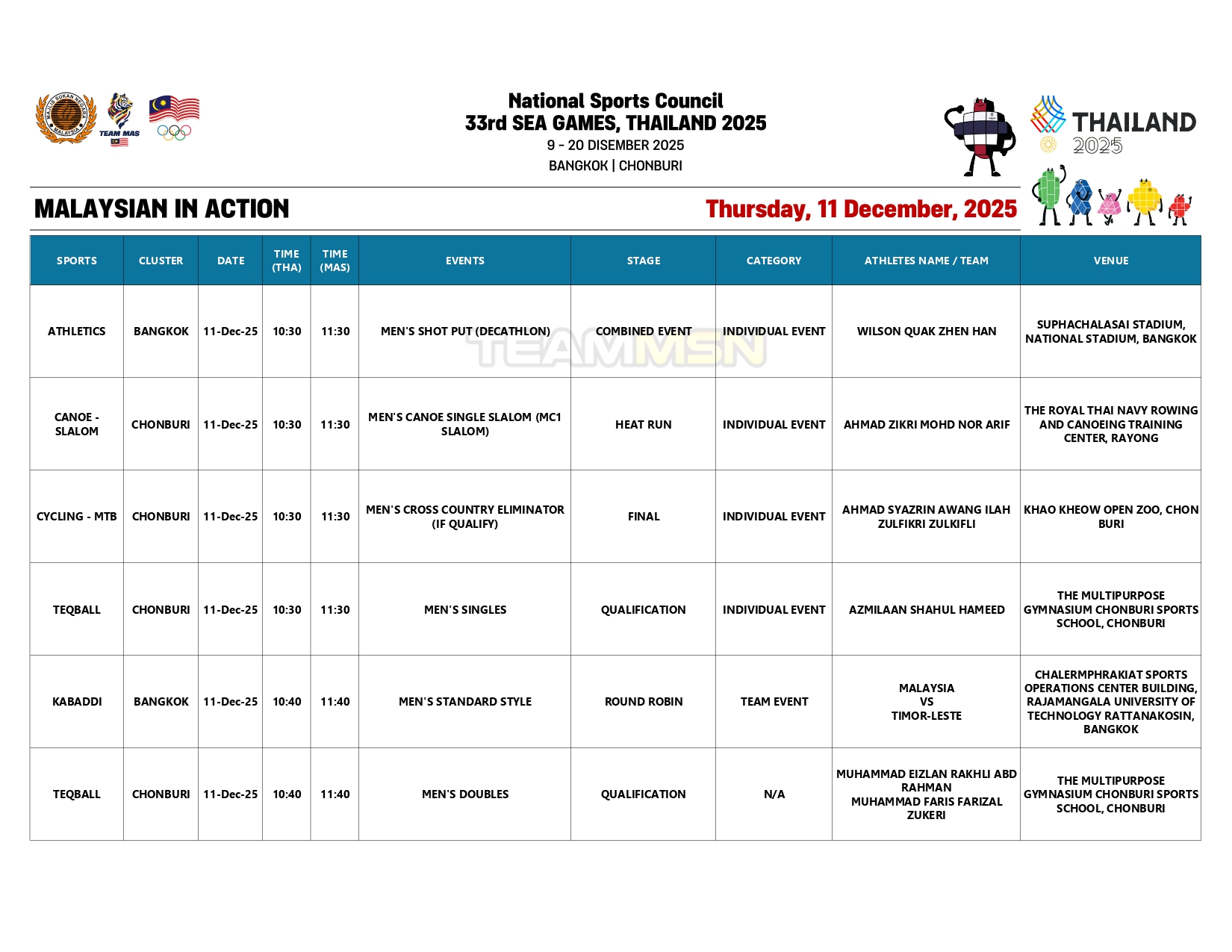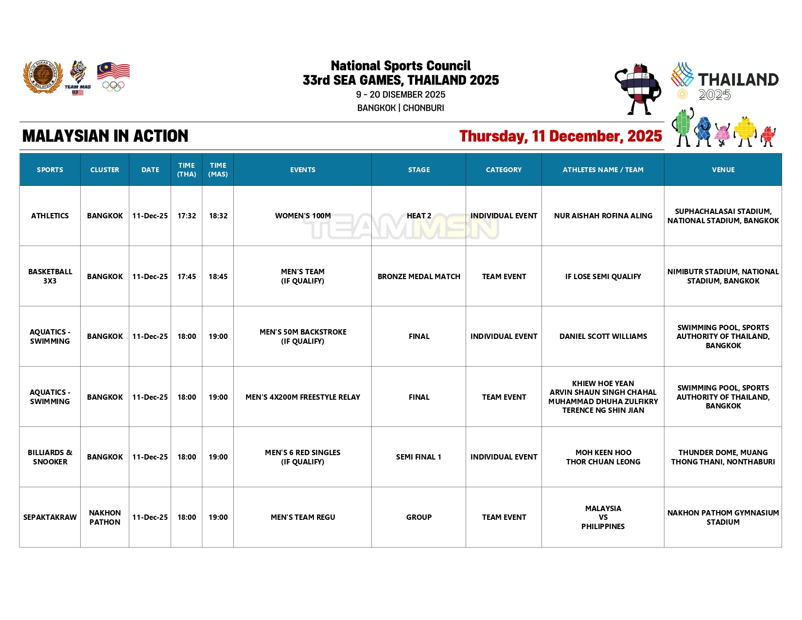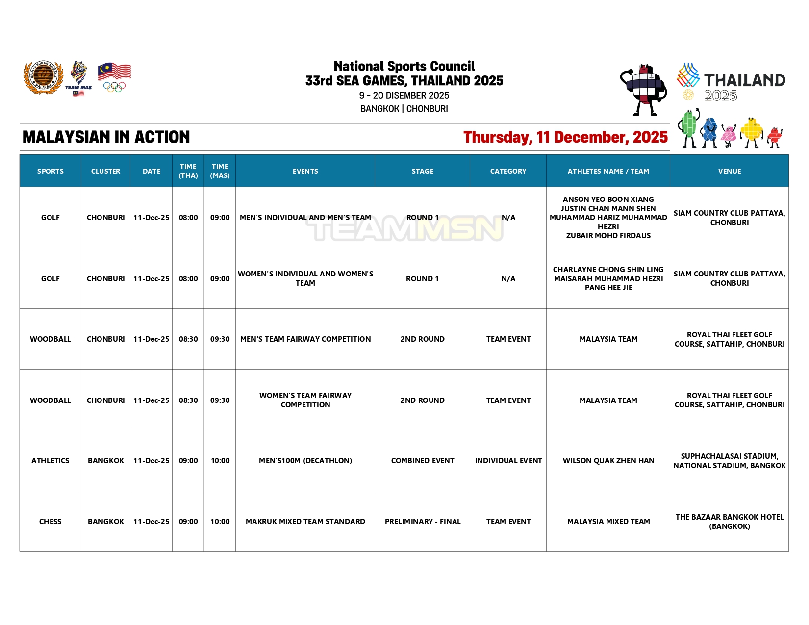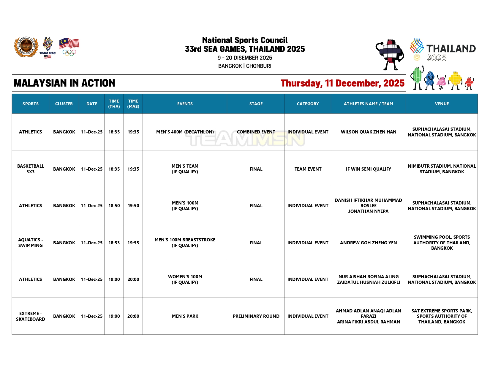 Saingan olahraga juga akan membuka tirai dengan acara dekatlon di Stadium Suphachalasai, Bangkok, dengan wakil negara, Wilson Quak, akan turun dalam disiplin 100m.