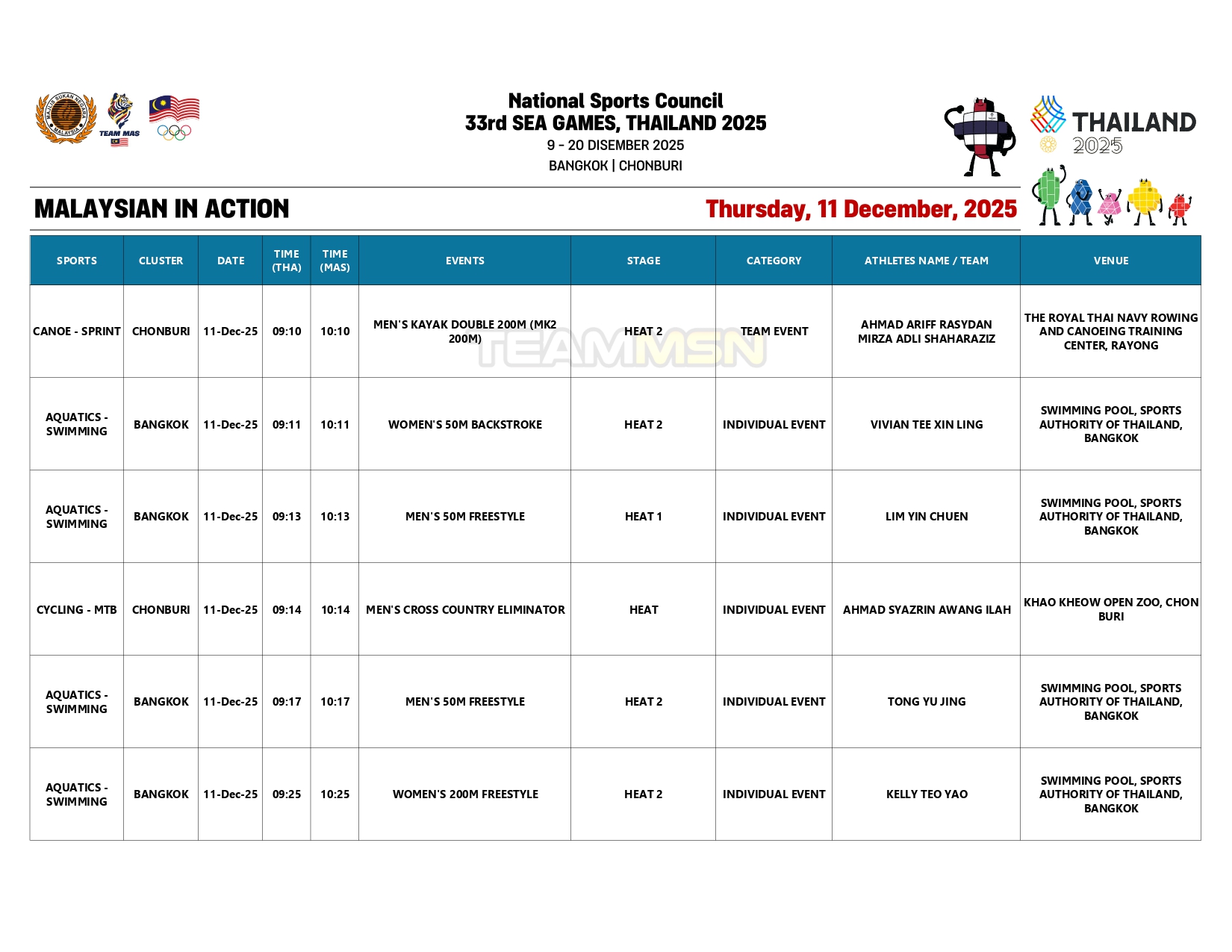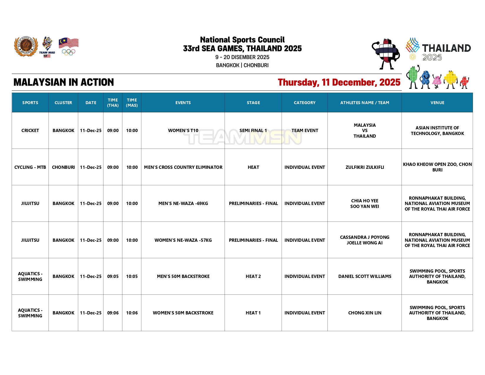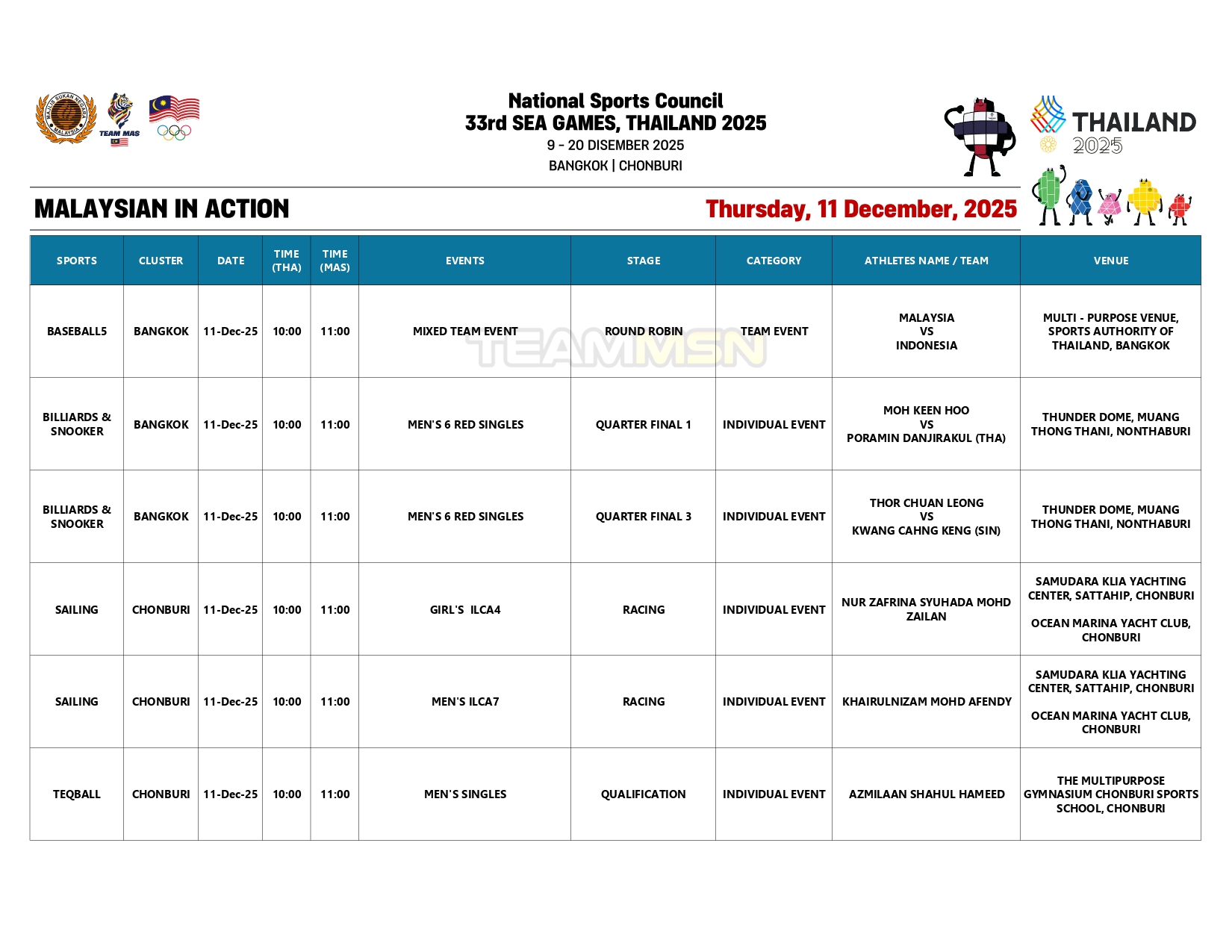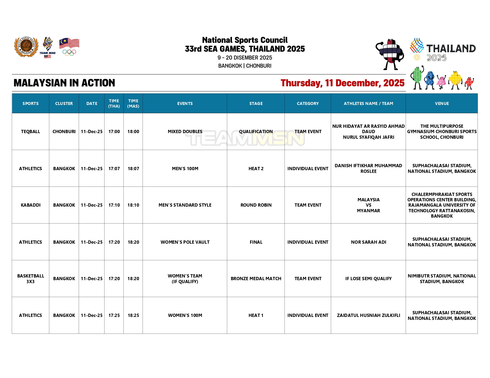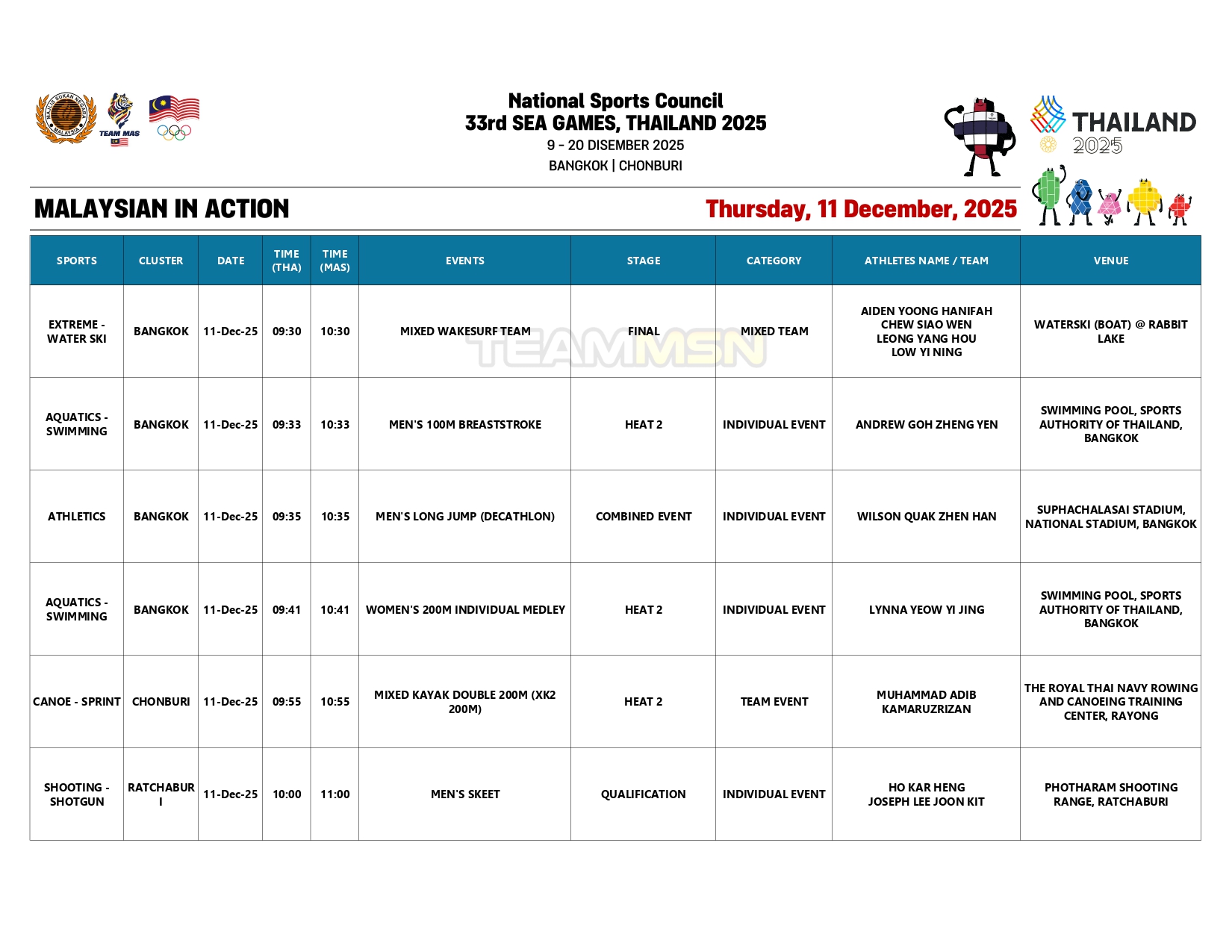 Saingan olahraga juga akan membuka tirai dengan acara dekatlon di Stadium Suphachalasai, Bangkok, dengan wakil negara, Wilson Quak, akan turun dalam disiplin 100m.
