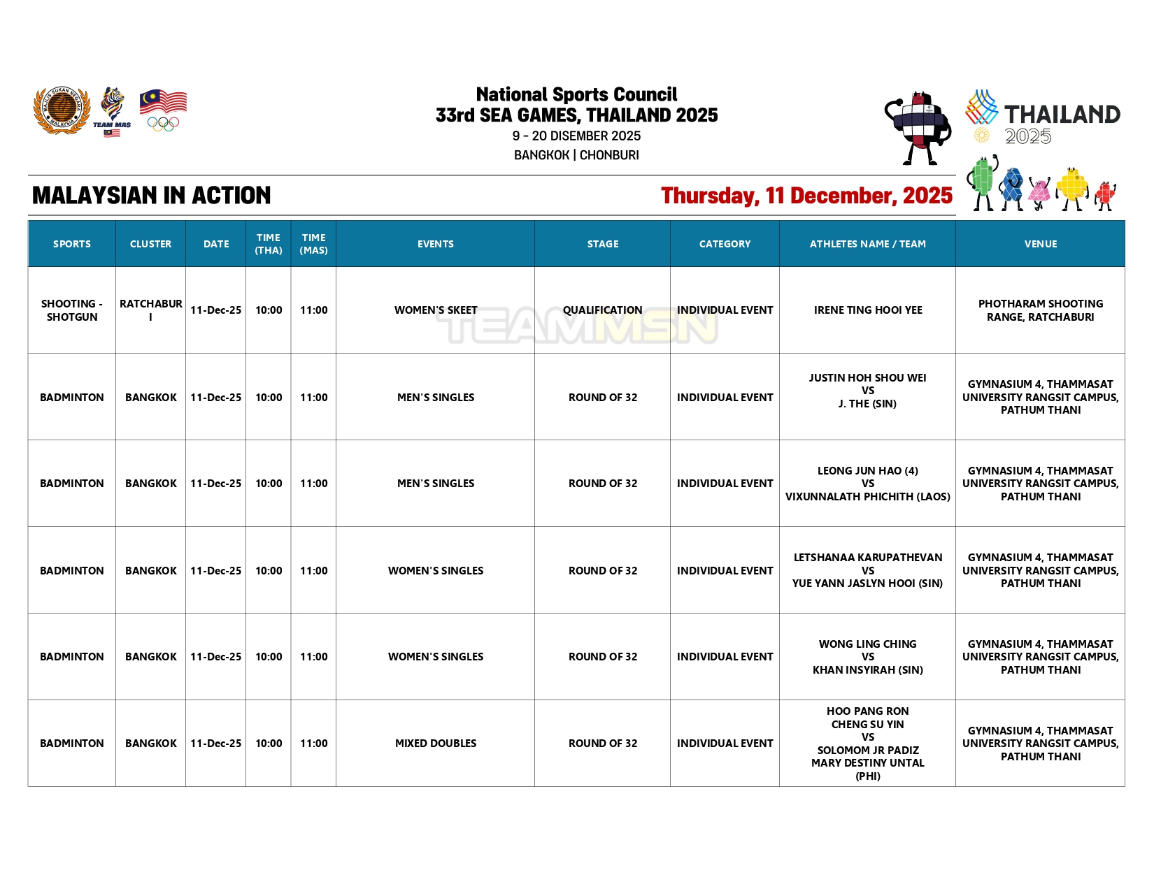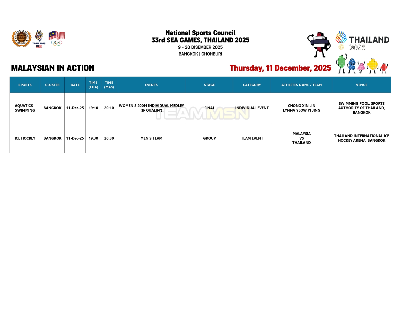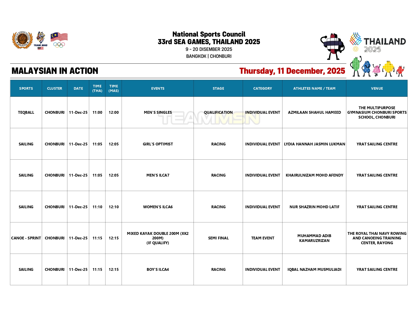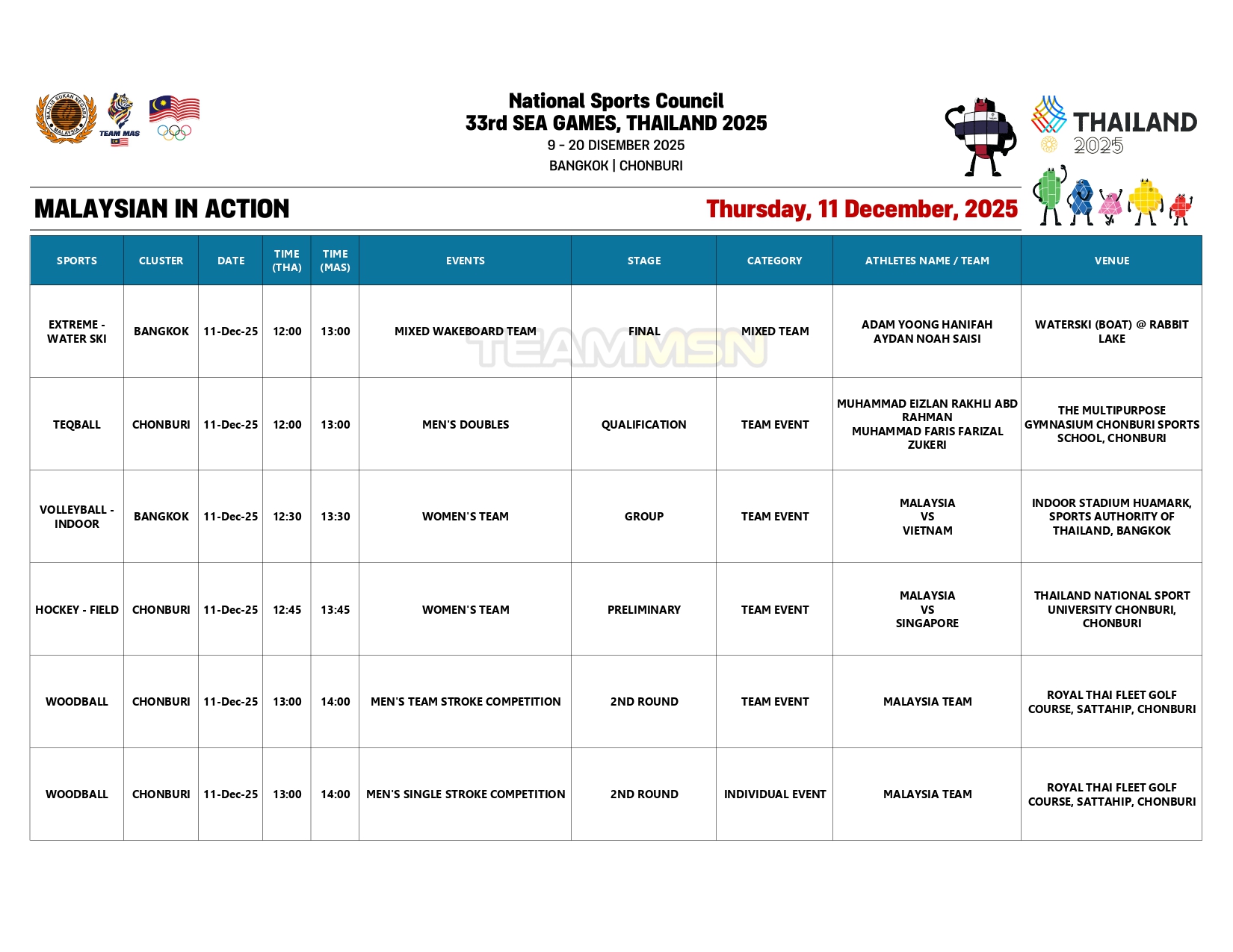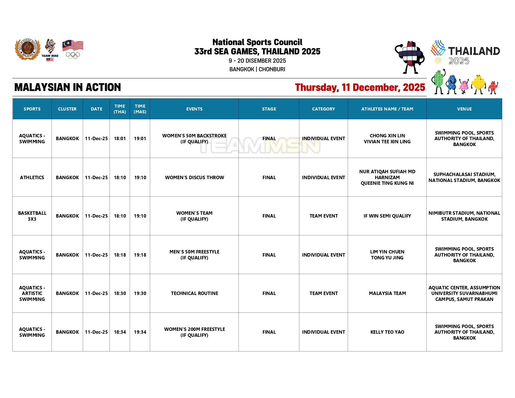 Saingan olahraga juga akan membuka tirai dengan acara dekatlon di Stadium Suphachalasai, Bangkok, dengan wakil negara, Wilson Quak, akan turun dalam disiplin 100m.