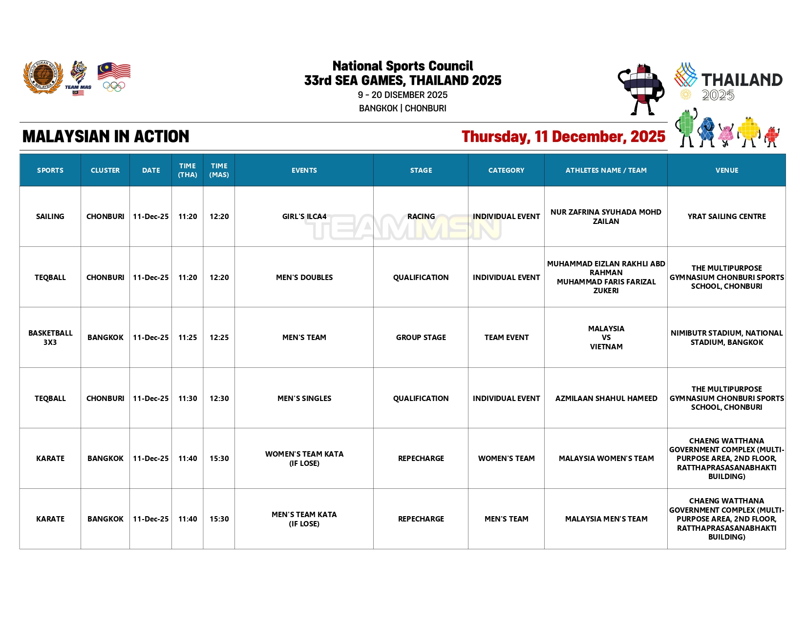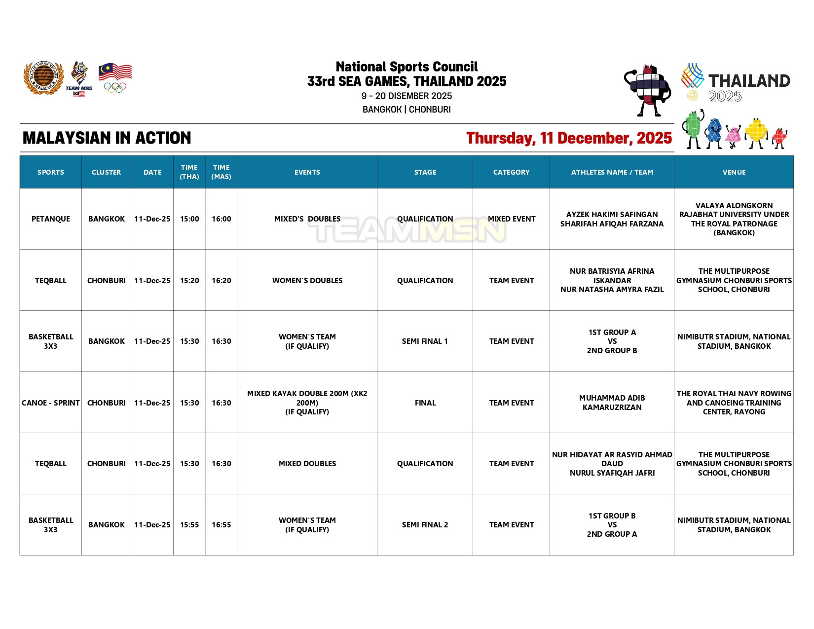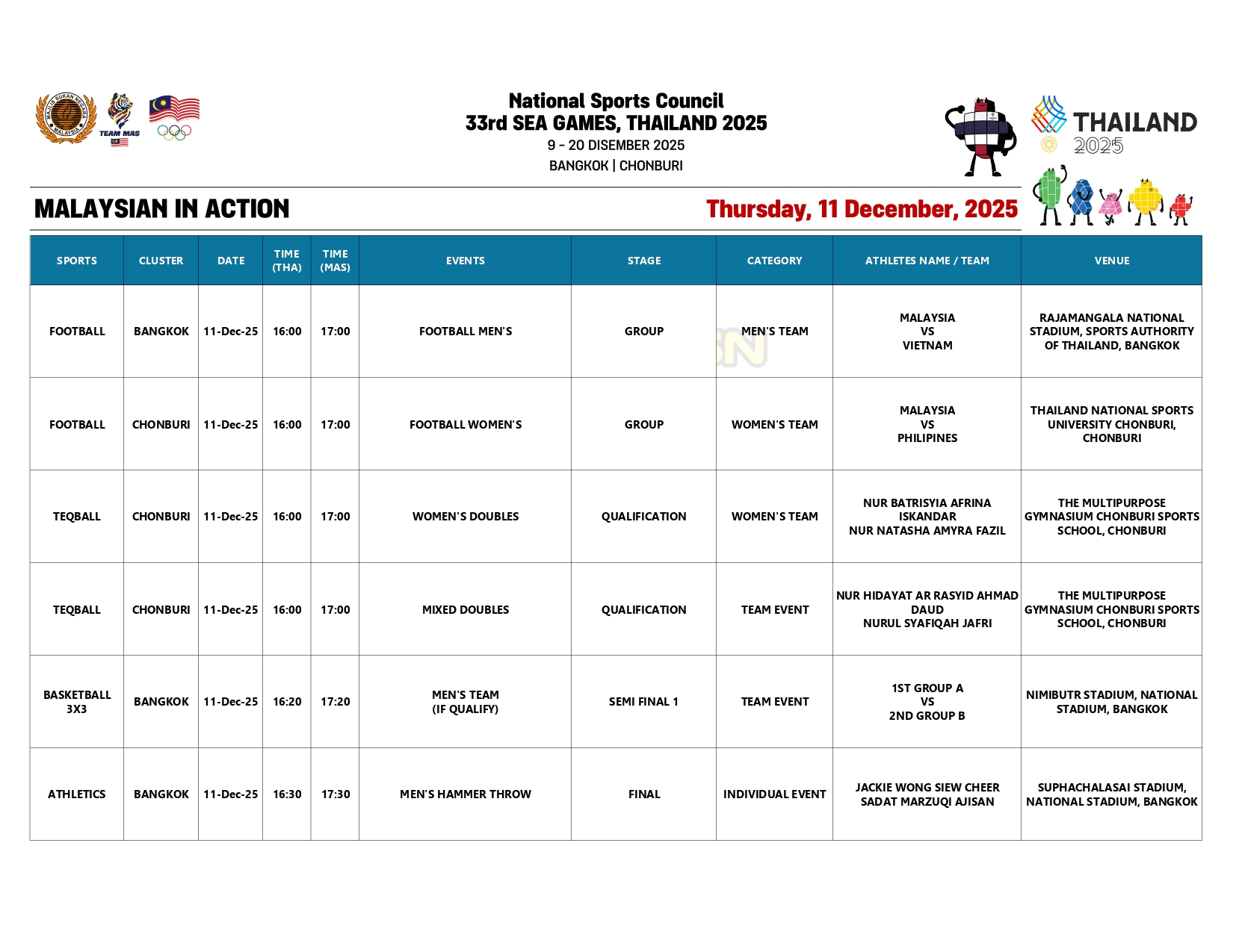 Berikut merupakan jadual penuh kontinjen negara hari ini: