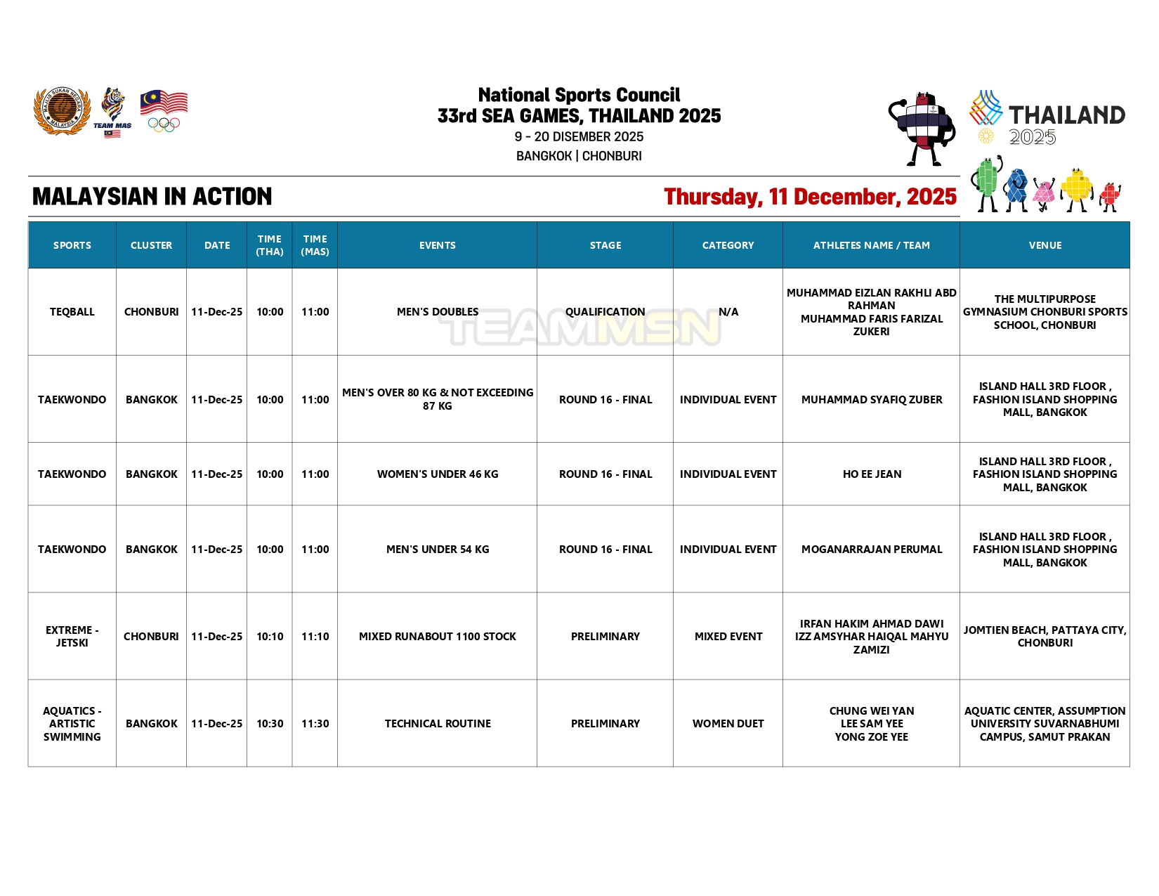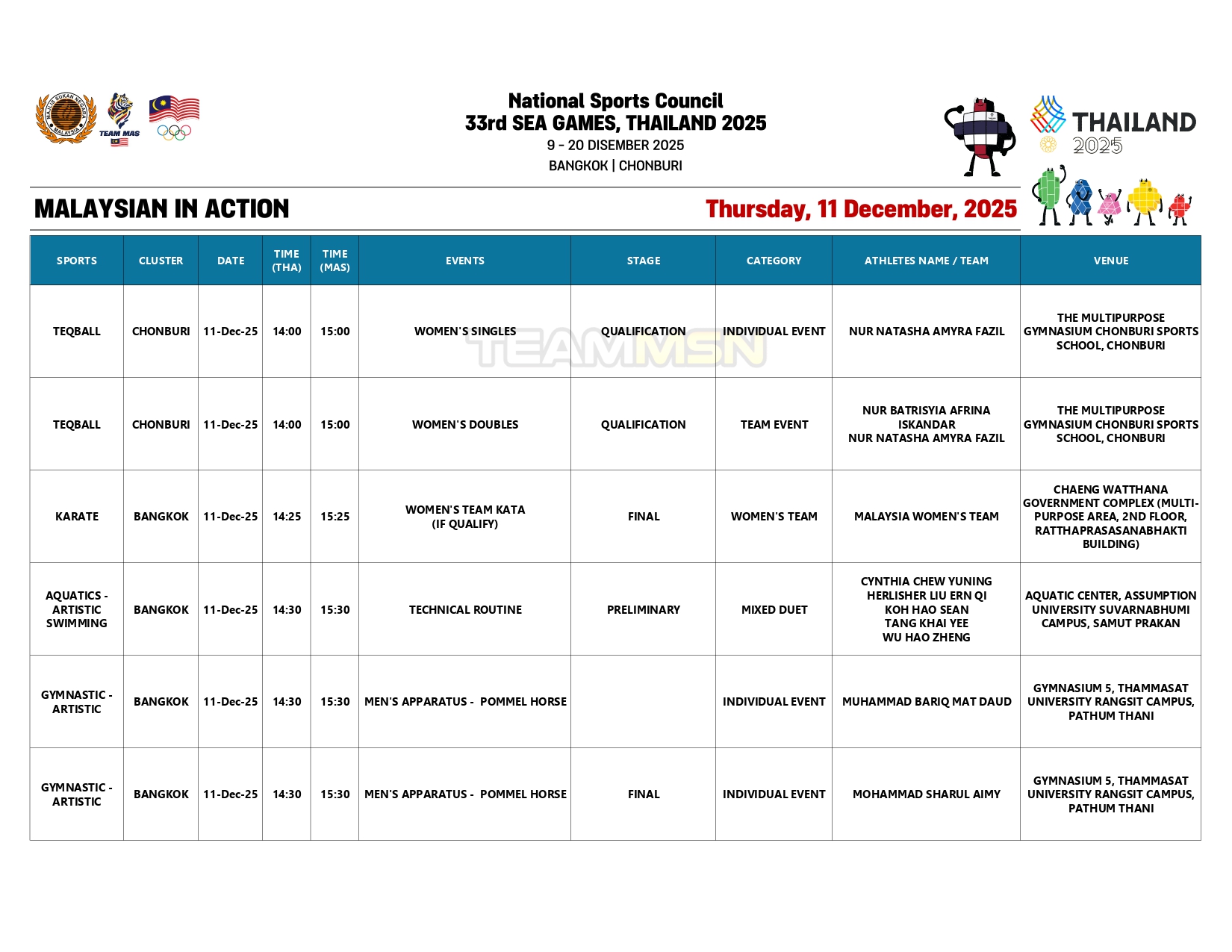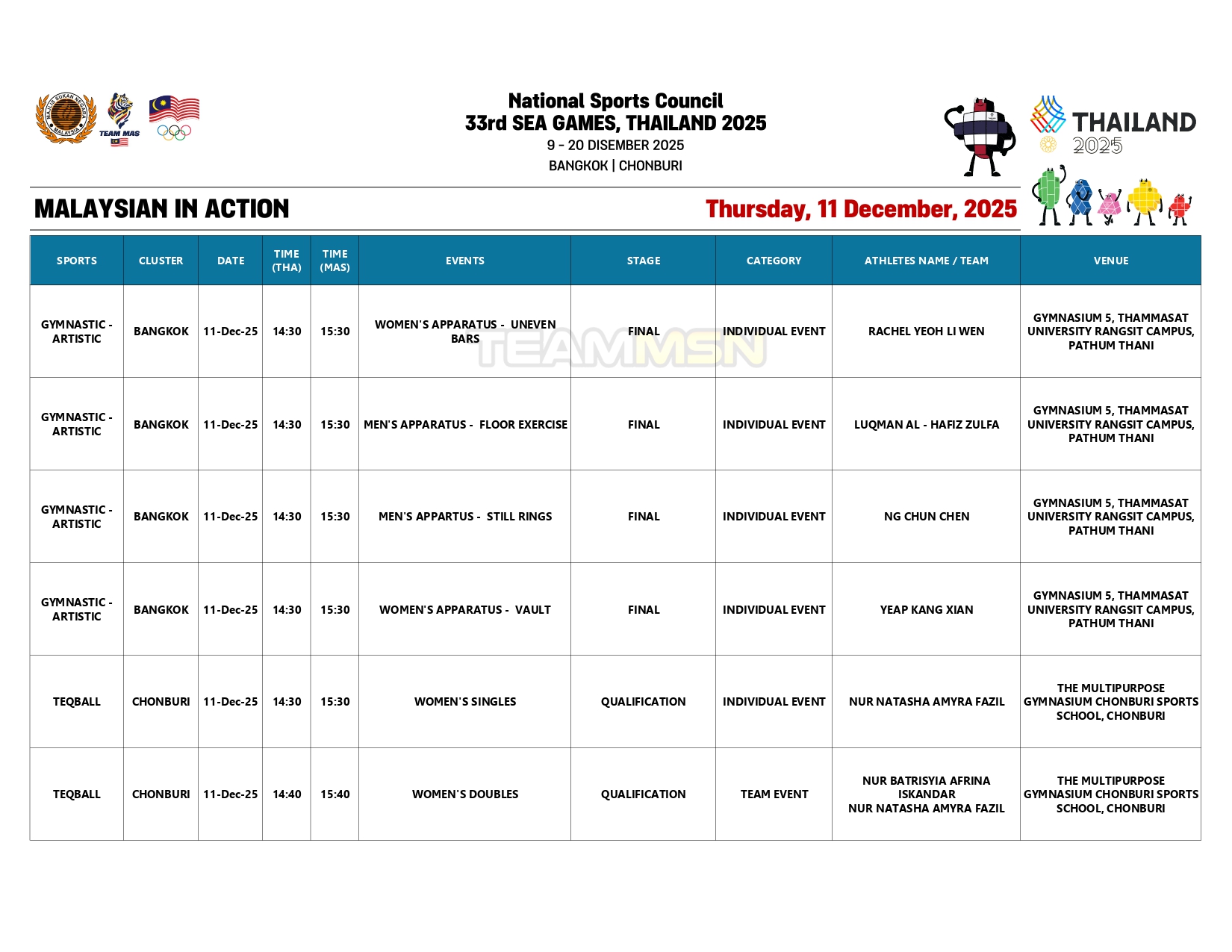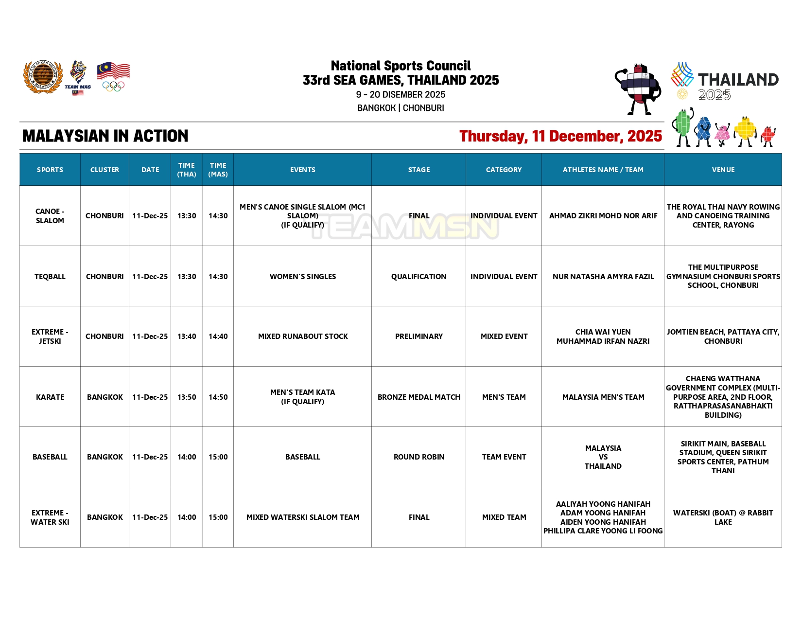 Berikut merupakan jadual penuh kontinjen negara hari ini: