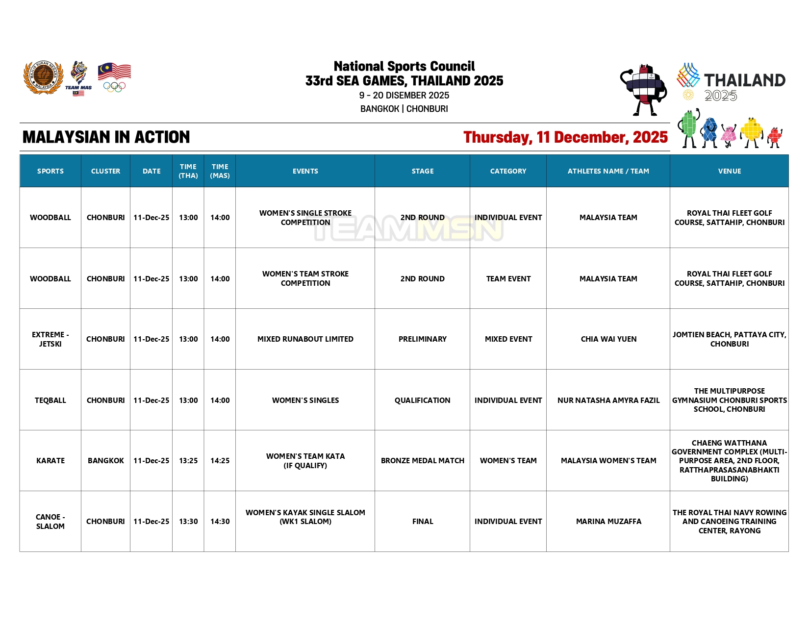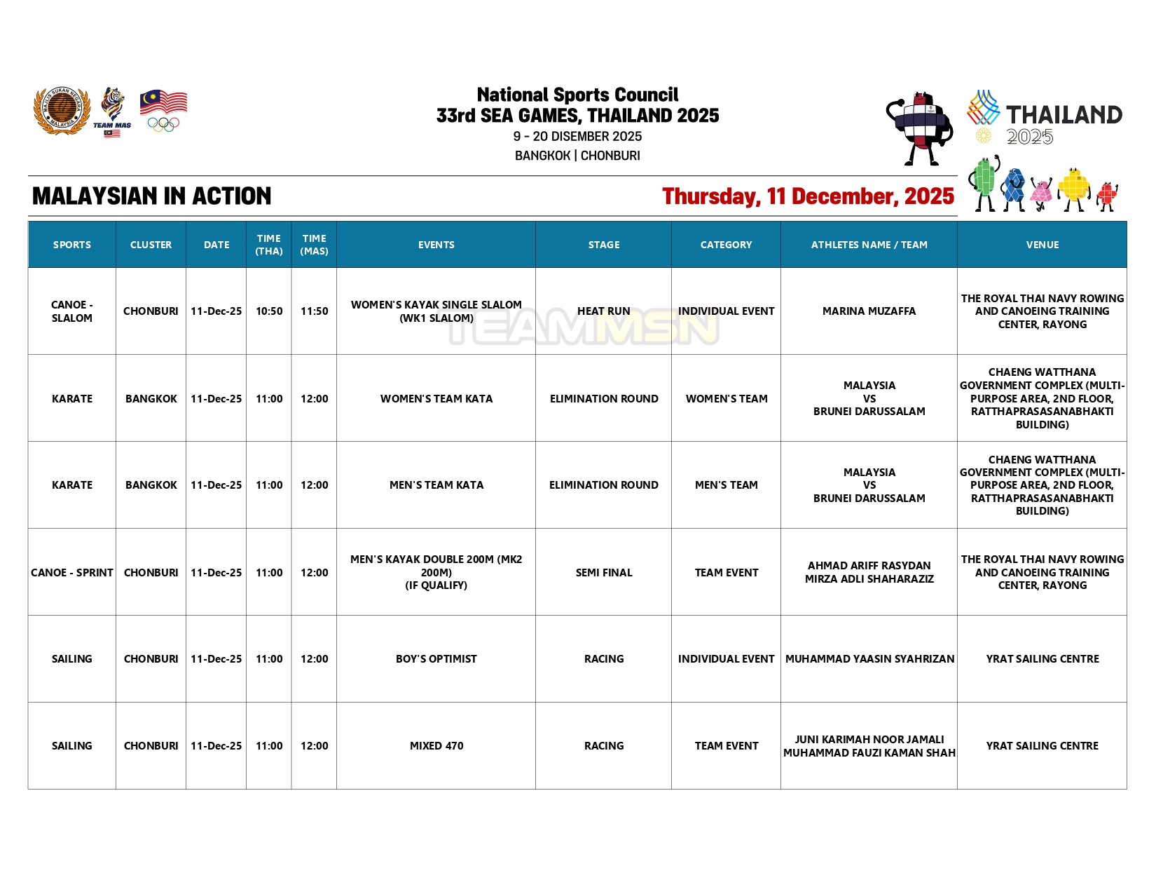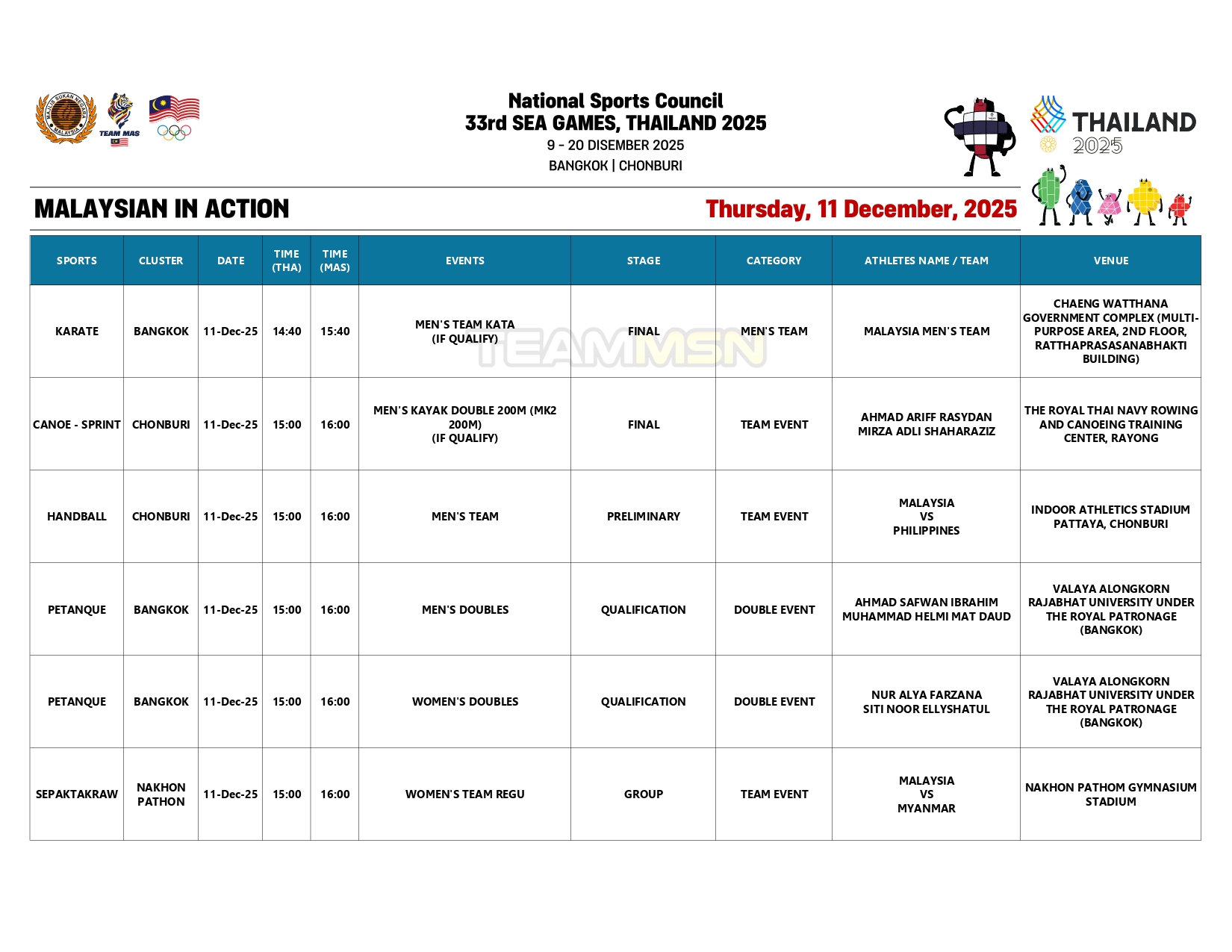 Selain itu, sandaran pingat emas kontinjen negara akan digalas skuad karate lelaki wanita, yang akan bertanding di Kompleks Kerajaan Chaeng Watthana.