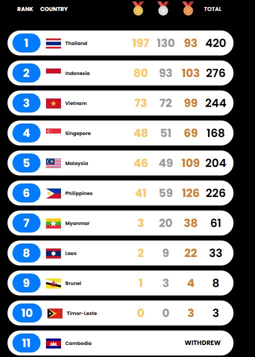 Menurut kenyataan Chef De Mission Malaysia ke Sukan SEA Thailand, Nurul Huda Abdullah, dan Ketua Pengarah Majlis Sukan Negara (MSN), Jefri Ngadirin, tumpuan kini tearah untuk Malaysia menamatkan saingan di tempat keempat keseluruhan.