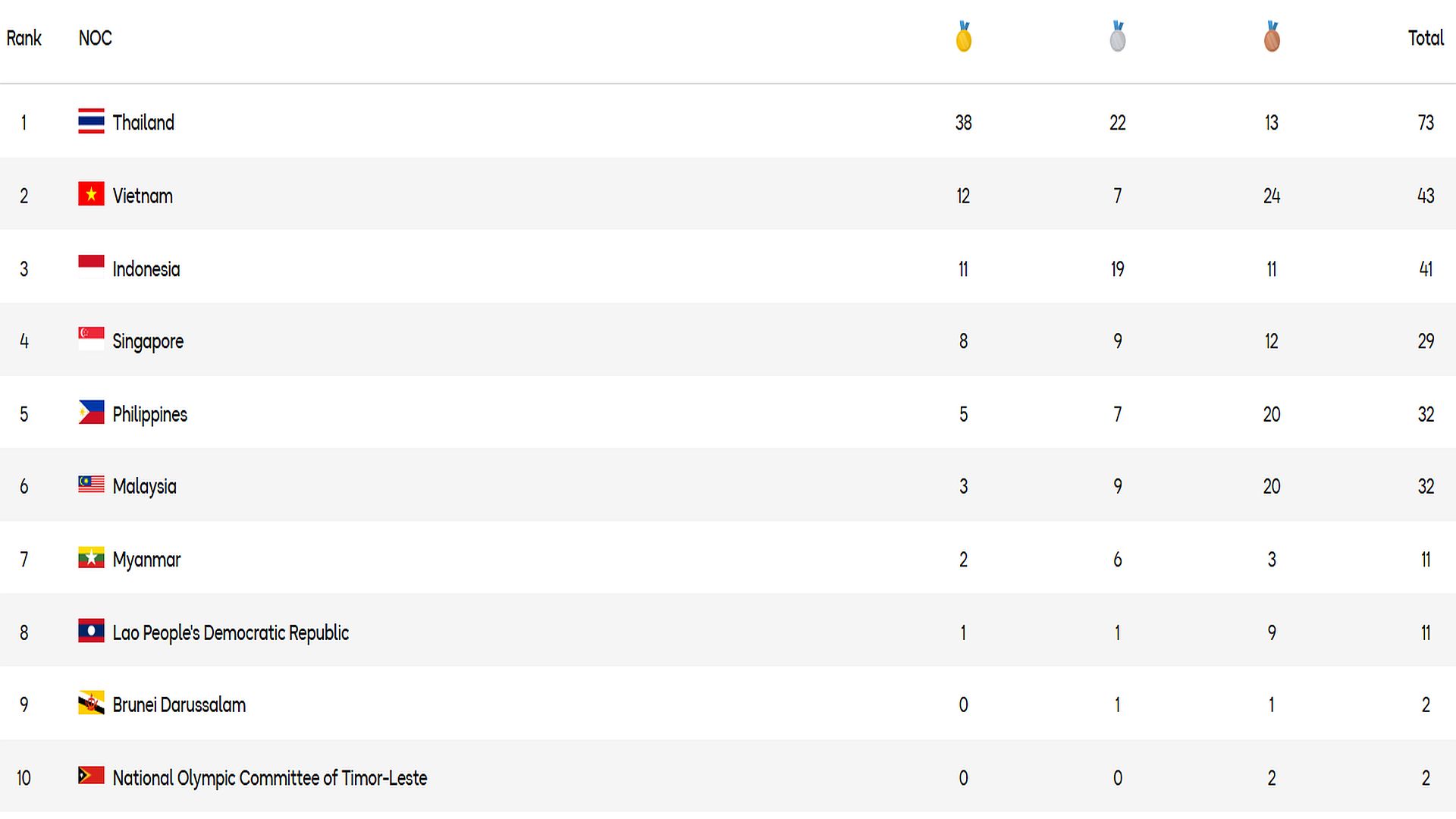 Sementara itu, pasukan tuan rumah pula terus unggul di puncak dengan kutipan 38 emas, 22 perak dan 13 gangsa untuk melengkapkan 73 pingat keseluruhan, diikuti Vietnam dan Indonesia.