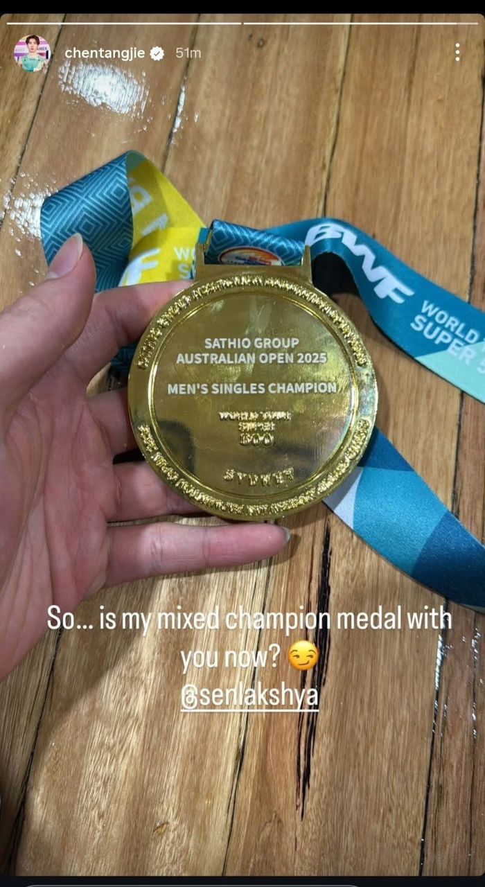 Kiriman laman Instagram story beregu campuran nombor satu negara itu seperti memberi bayangan seperti dia tertukar pingat bersama juara perseorangan lelaki Terbuka Australia, Lakshya Sen.