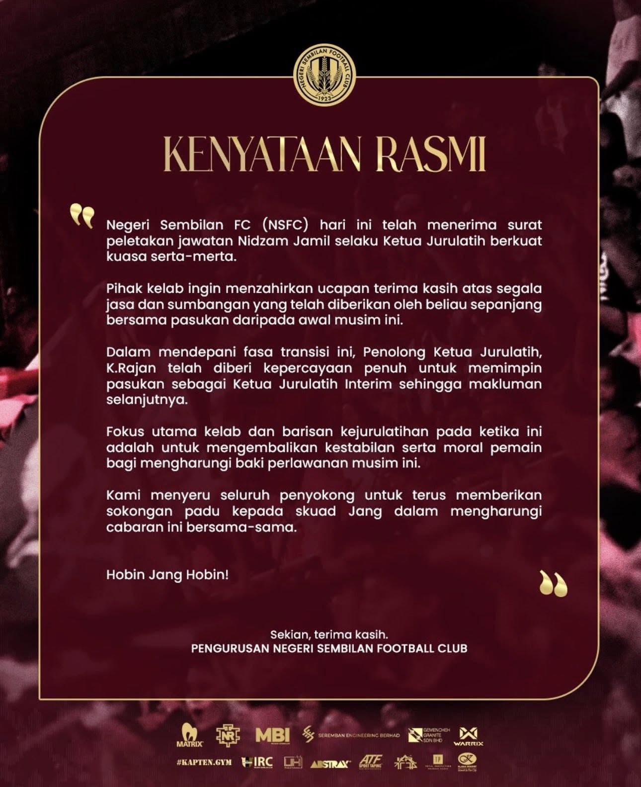 Nidzam Jamil mengumumkan peletakan jawatannya sebagai ketua jurulatih Negeri Sembilan dengan serta-merta.