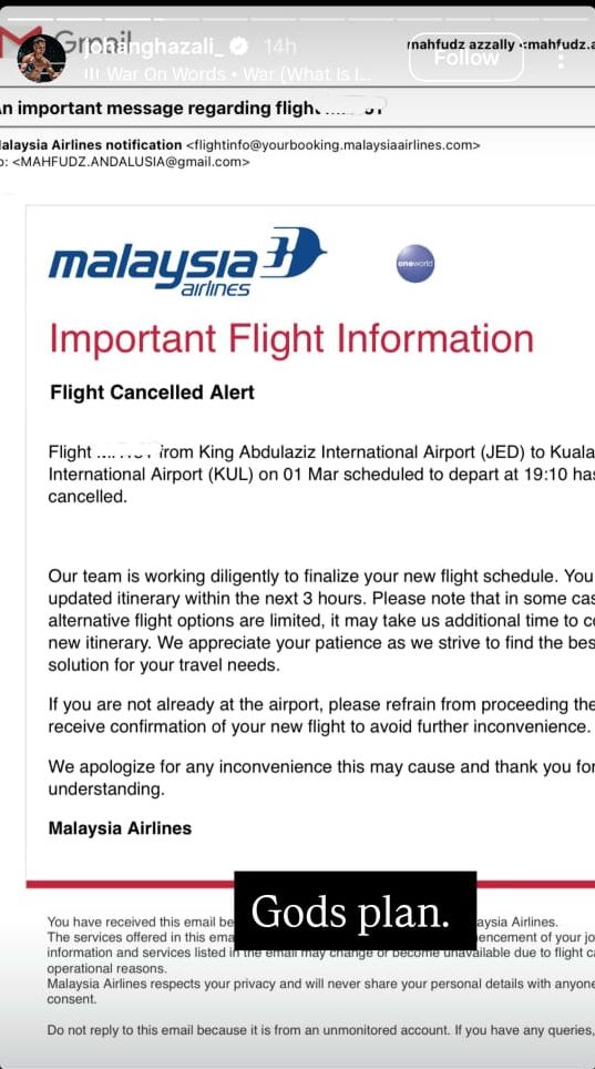 Johan atau Jojo memuat naik status penerbangannya di Instagram menyaksikan dia dan keluarga terkandas dari Lapangan Terbang Sultan Abdulaziz, Jeddah hari ini.
