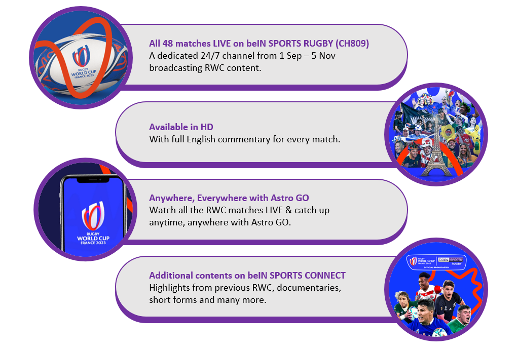 Kesemua 48 perlawanan bagi edisi 2023, yang akan berlangsung di Perancis dari 8 September hingga 28 Oktober depan, akan disiarkan dalam saluran beIN SPORTS RUGBY (CH809).